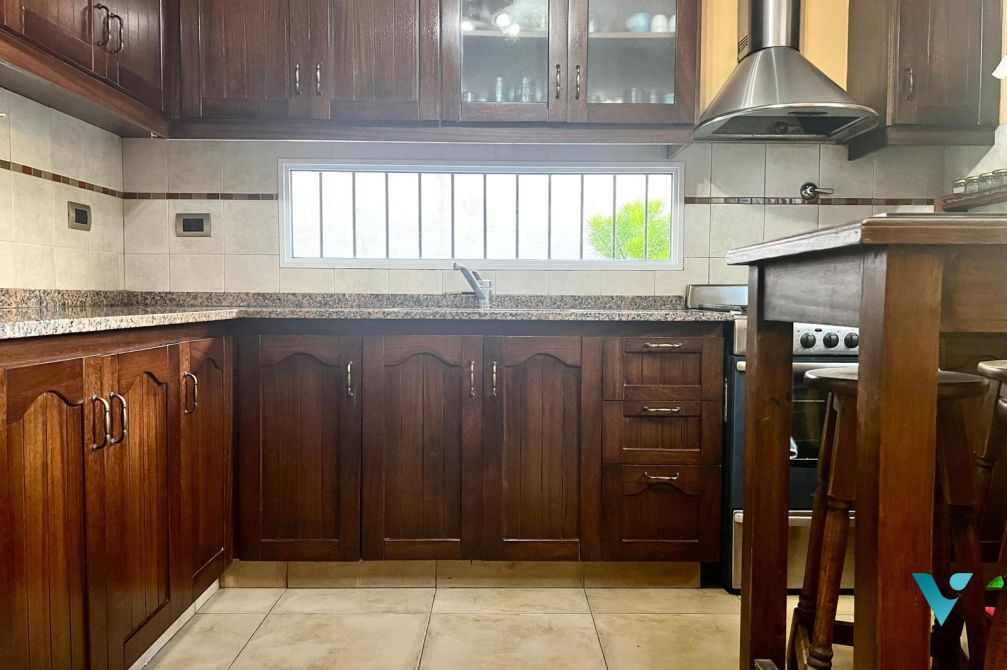 La cocina, equipada con muebles de madera bajo mesada y alacena,