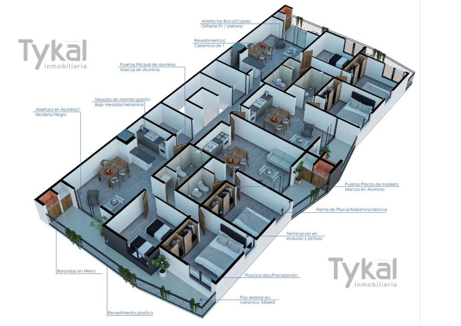 *Los pisos de los espacios exteriores comunes, patios, balcones y terrazas serán de cerámica marca Alberdi o similar de 1ea. Y las veredas serán del mismo revestimiento o se realizara en cemento rayado.