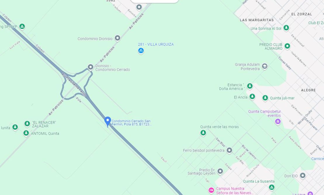 Está ubicada en la localidad de Pontevedra, Partido de Merlo, linda con el camino parque del Buen Ayre en su intersección con la ruta provincial 1003, ex avda. Patricios, en una inmejorable posición respecto de la conexión de la autovía con el área.
