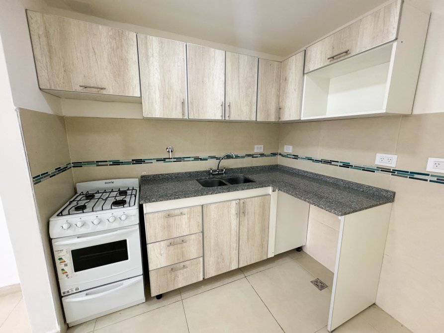 • Cocina equipada con artefacto, conexión para extractor de aire, conexión para lavarropas, bajo mesada y alacena amplia de melamina con perfiles de aluminio, mesada de granito con bacha doble de acero