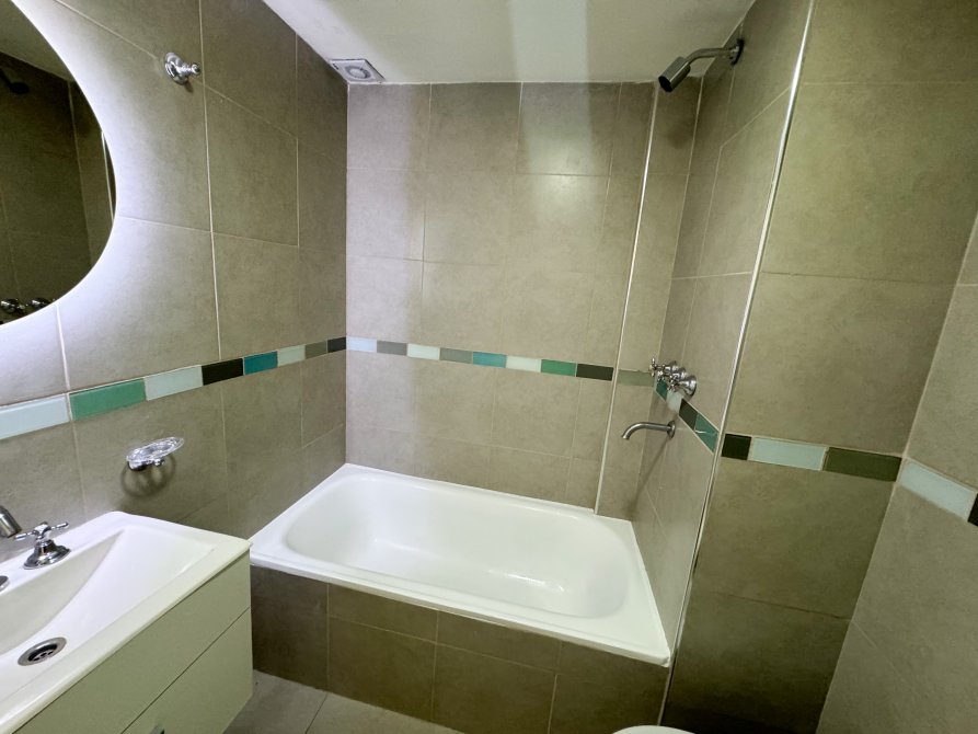 • Baño completo con bañera, vanitory, espejo con luz led, inodoro y bidet, revestido en cerámica y guardas decorativas