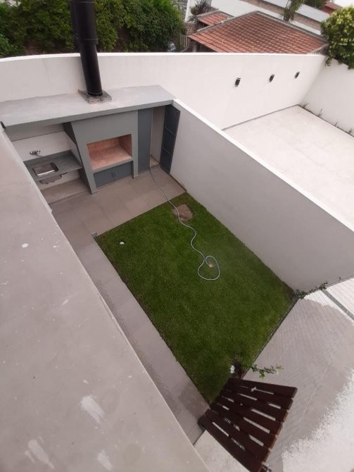 primera marca/ patio con terreno absorbente y circulación de piso de porcellanato, sector parrilla con mesada de granito gris mara, bacha de