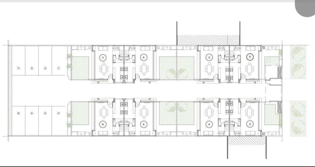 Conjunto de 8 (ocho) viviendas unifamiliares. Acceso peatonal y vehicular, a través de portón motorizado, con superficie guarda coche para 8 (ocho) vehículos.