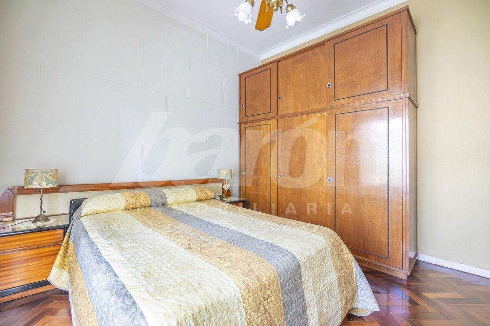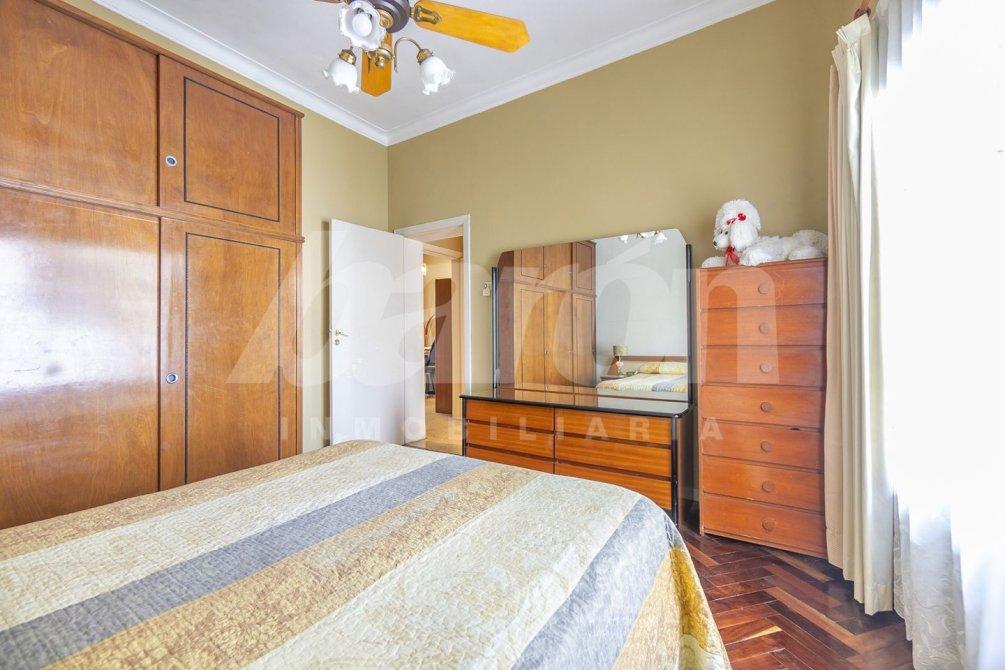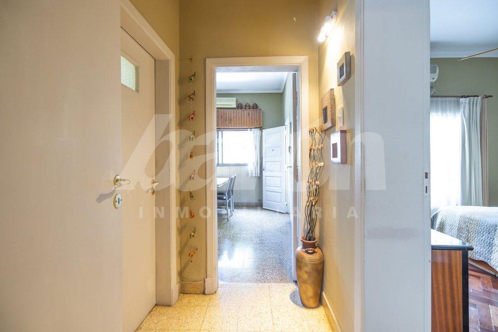 A través del pasillo distribuidor, se accede a un baño completo con bañera y a dos dormitorios, ambos con pisos de parquet, placard empotrado y ventilador de techo. El dormitorio principal se orienta al frente, mientras que el segundo cuenta con ventana al contrafrente, aportando gran luminosidad.