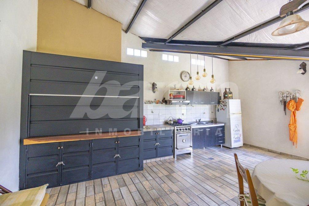 La cocina comedor diario es amplia y funcional, equipada con muebles bajo y sobre mesada, anafe y horno empotrado, pisos cerámicos y estufa para calefacción.