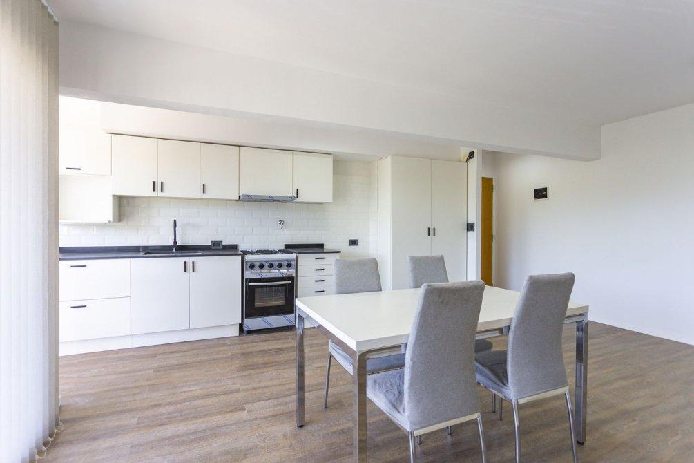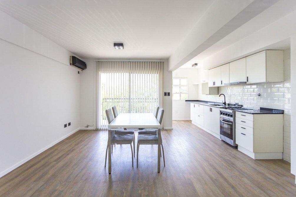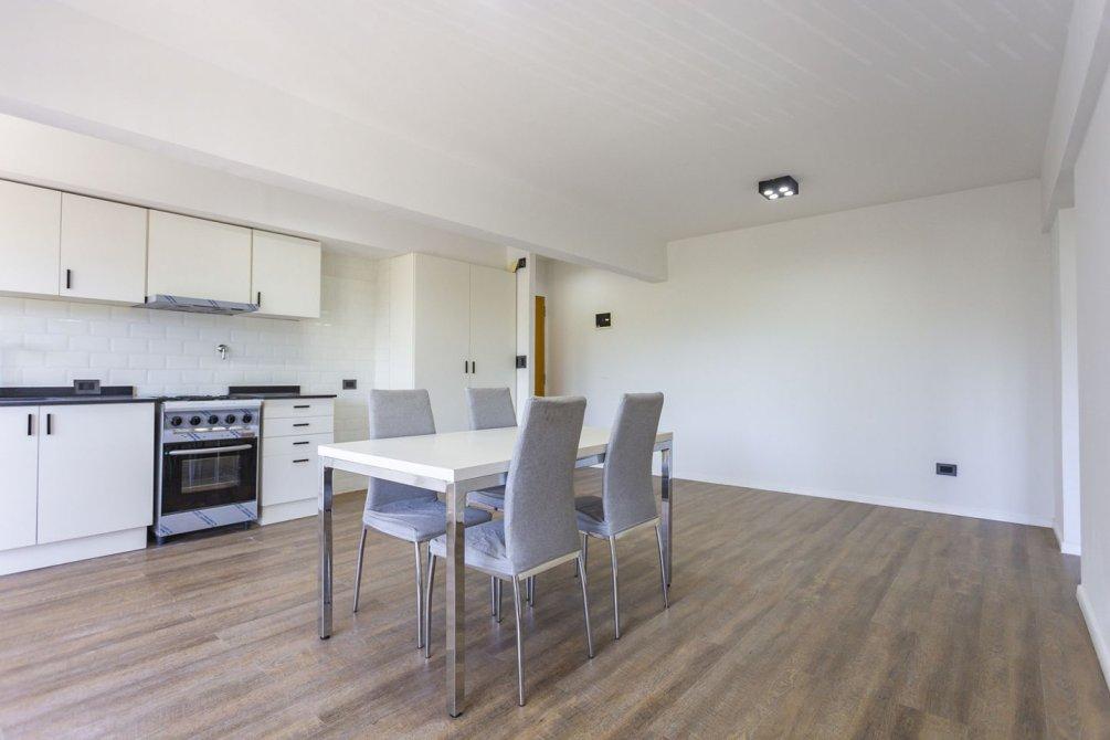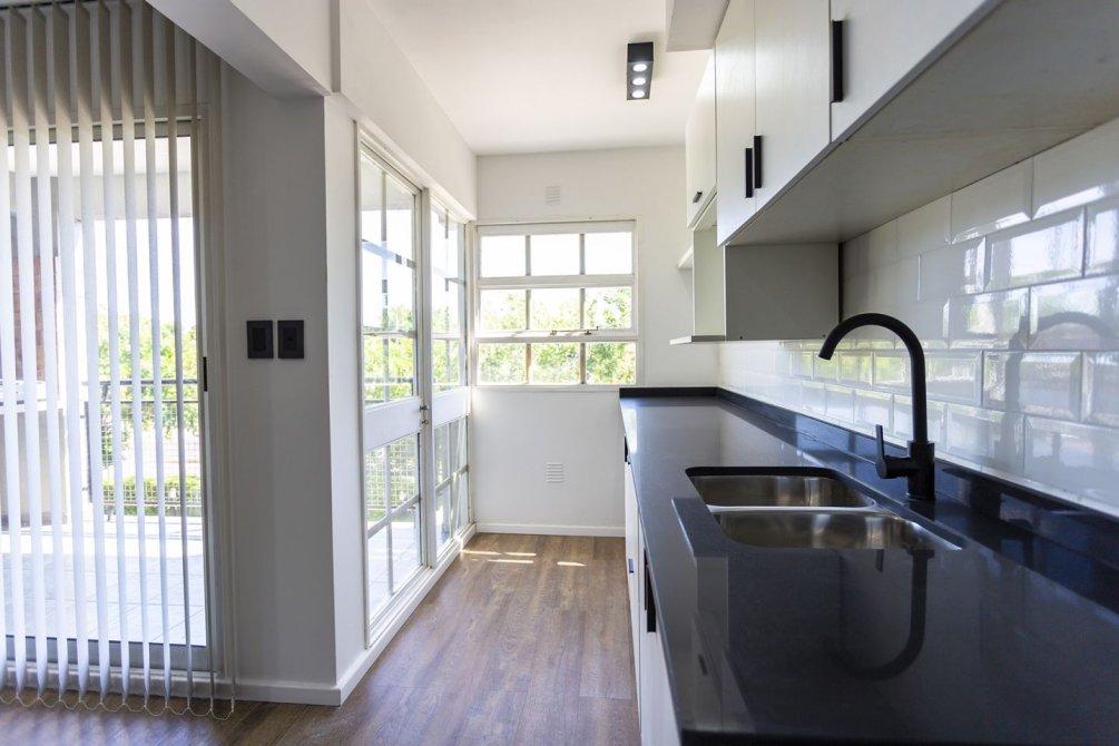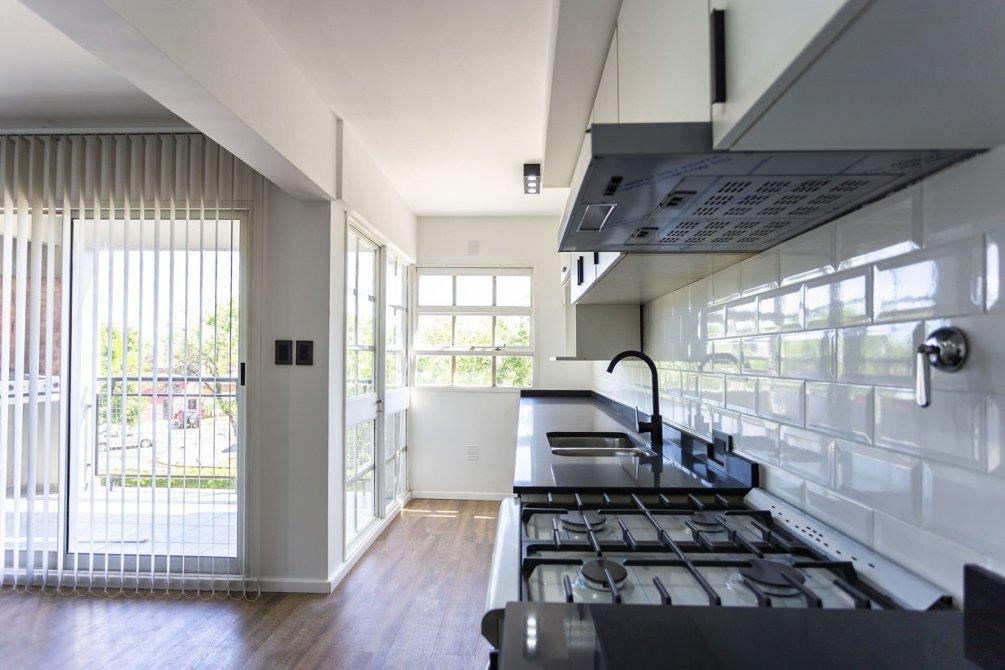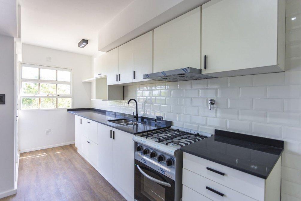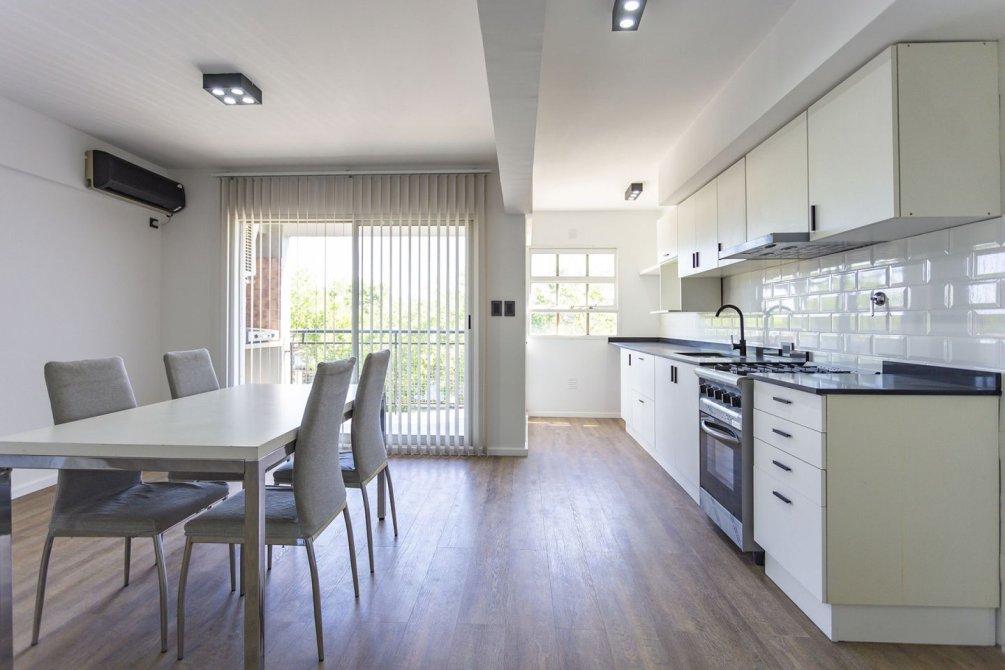 La cocina integrada, totalmente renovada, cuenta con muebles bajo y sobre mesada, extractor, mesada de silestone y pre instalación para lavarropas, combinando diseño moderno y funcionalidad.