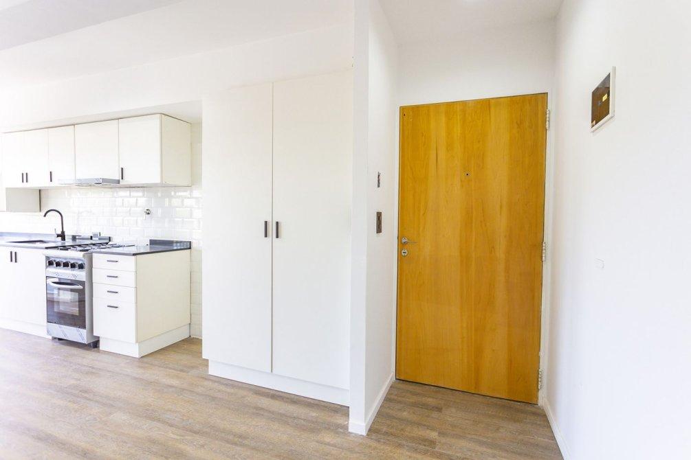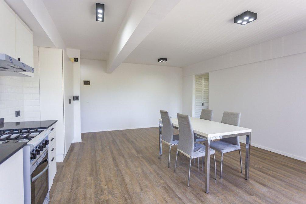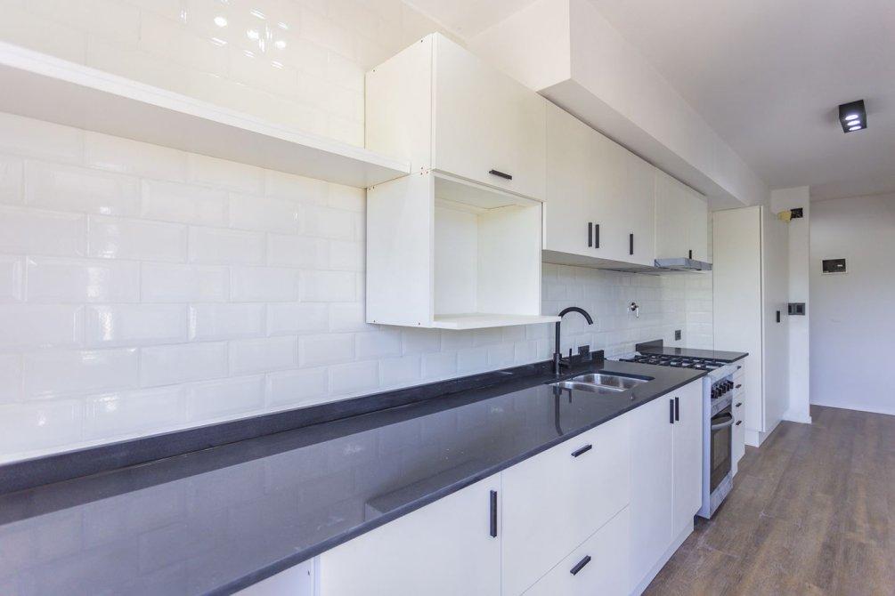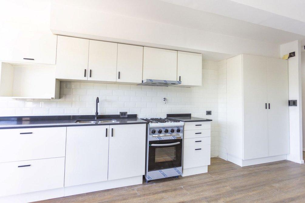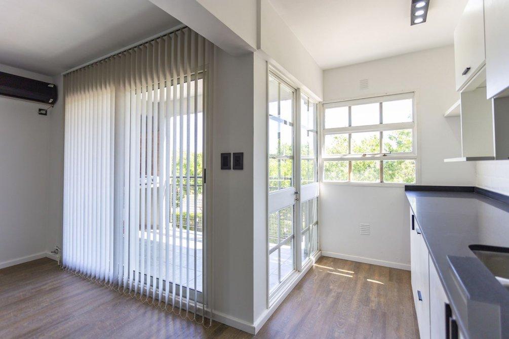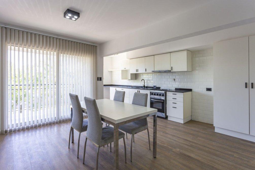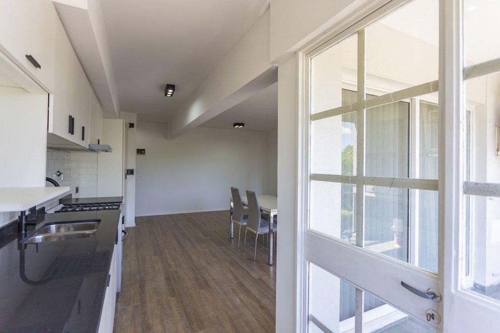 La cocina integrada, totalmente renovada, cuenta con muebles bajo y sobre mesada, extractor, mesada de silestone y pre instalación para lavarropas, combinando diseño moderno y funcionalidad.