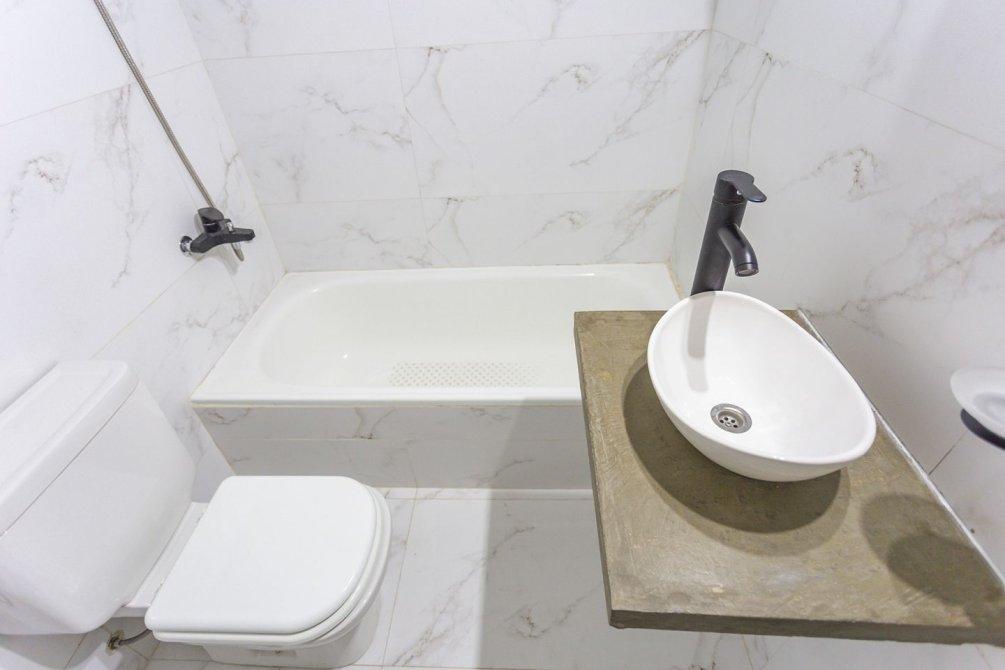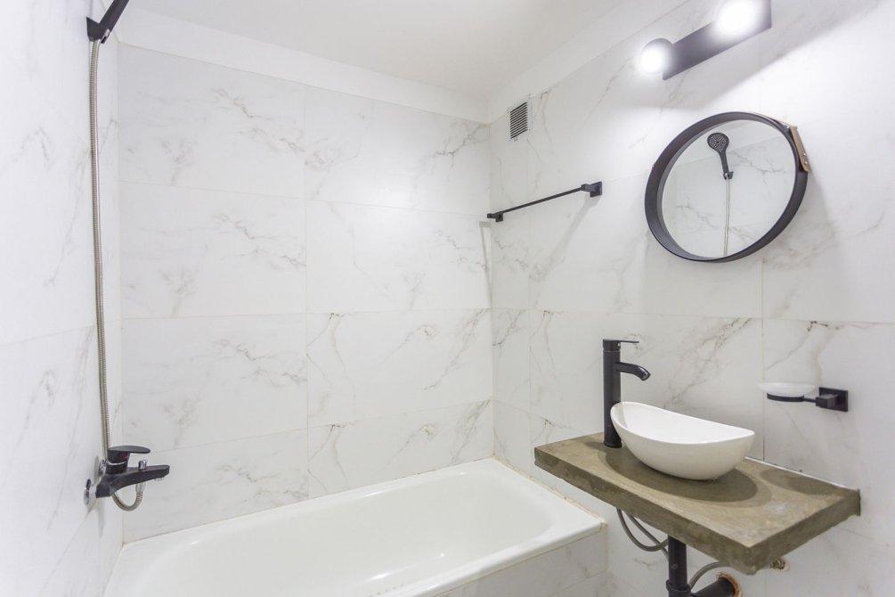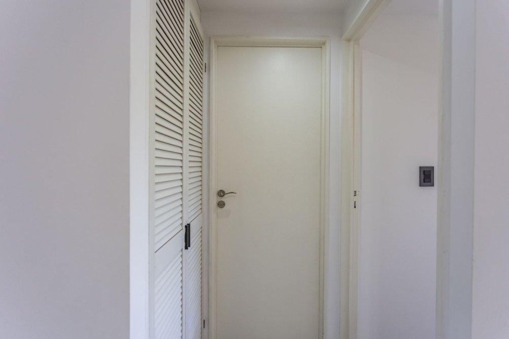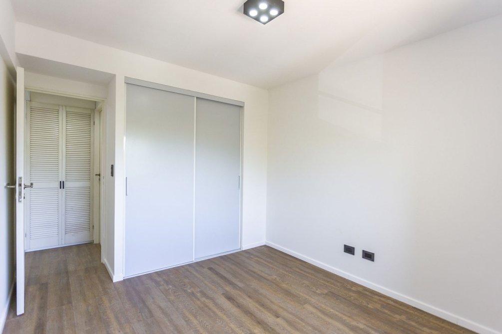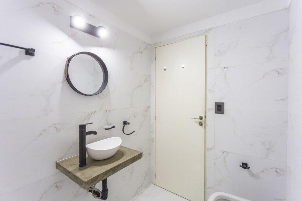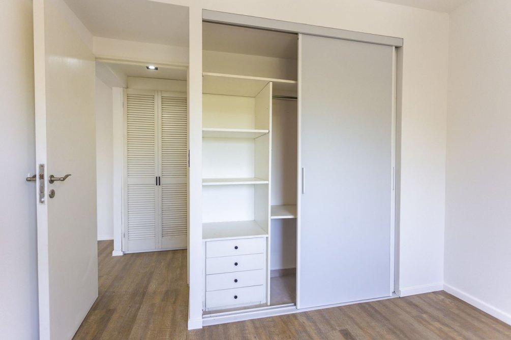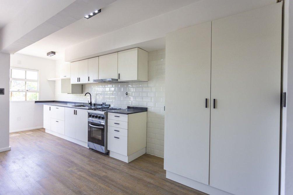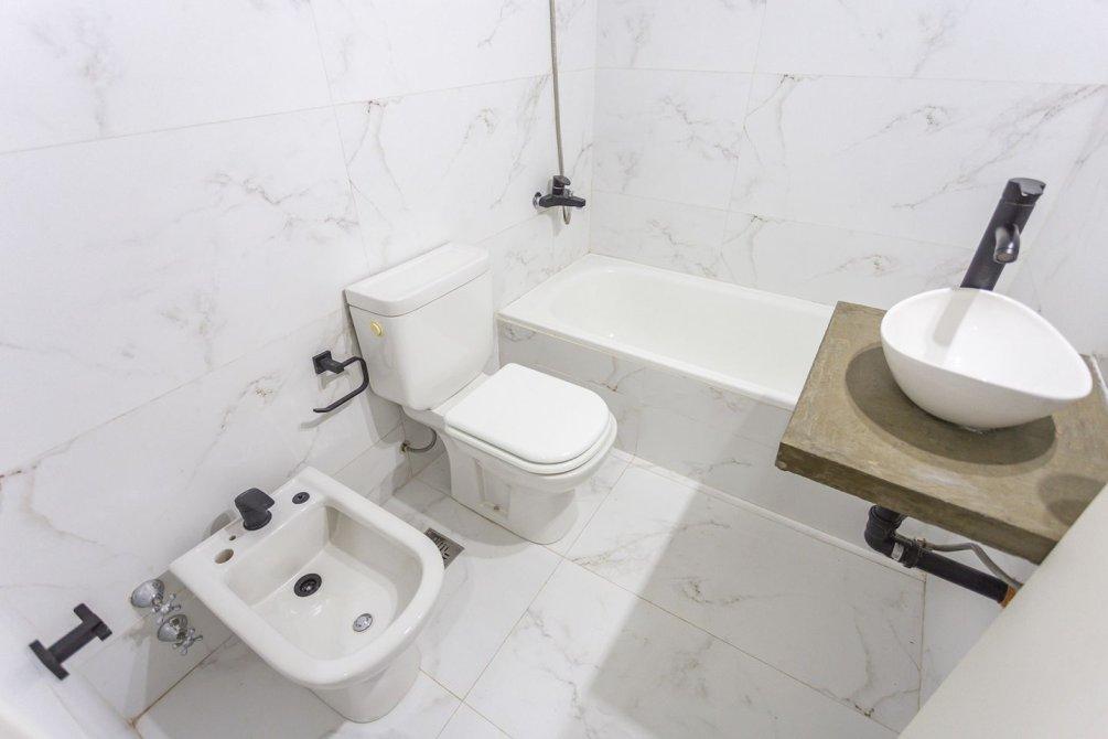 A través del pasillo distribuidor, se encuentra un mueble de guardado adicional, un dormitorio de amplias dimensiones con pisos flotantes de PVC y placard con frente e interior completo, y un baño completo con bañera, también reciclado íntegramente a nuevo.