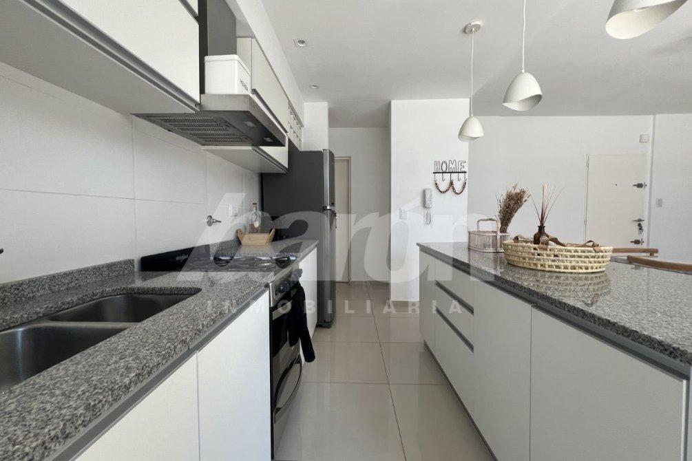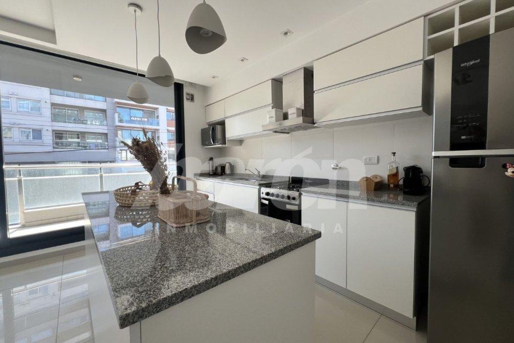 La cocina, integrada al ambiente principal, está equipada con muebles bajo y sobre mesada, mesada e isla en granito con espacio de guardado, brindando una combinación perfecta entre diseño y funcionalidad.