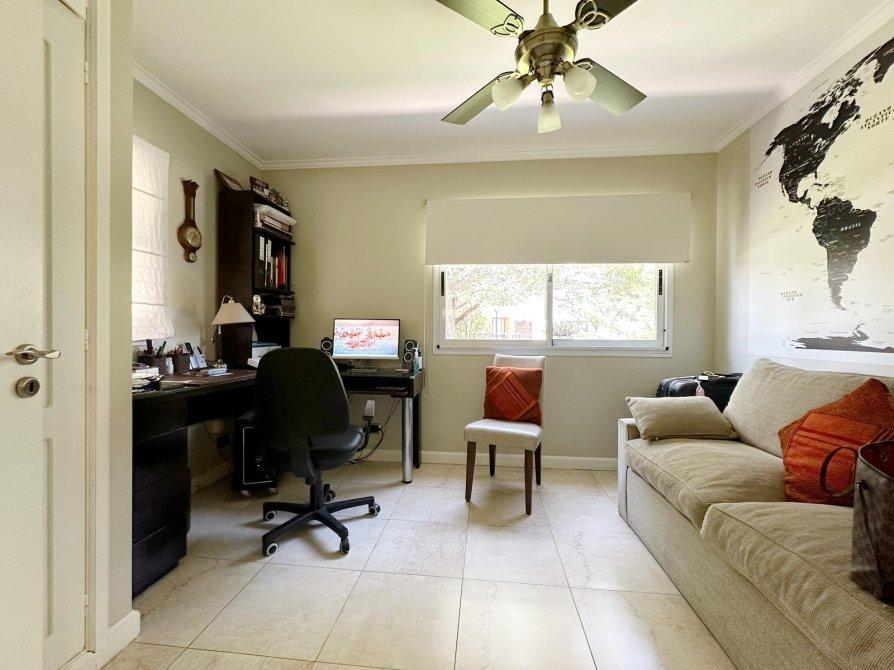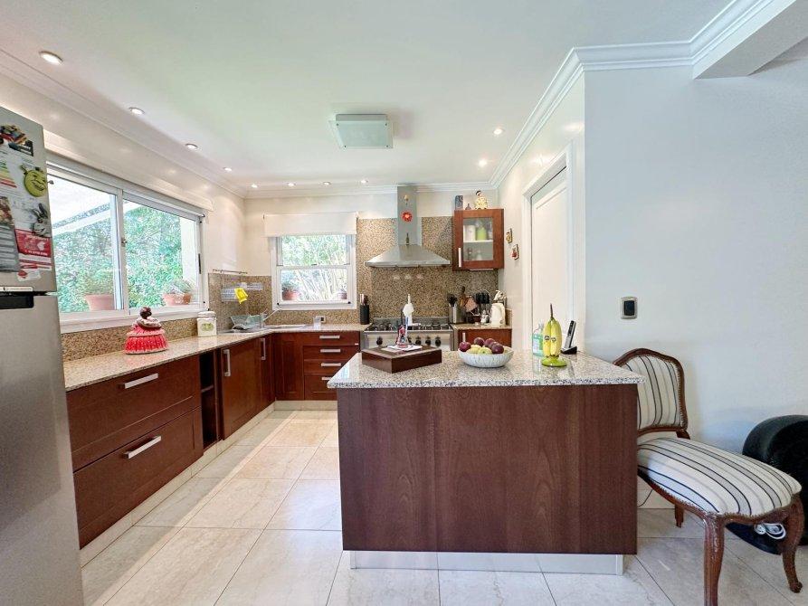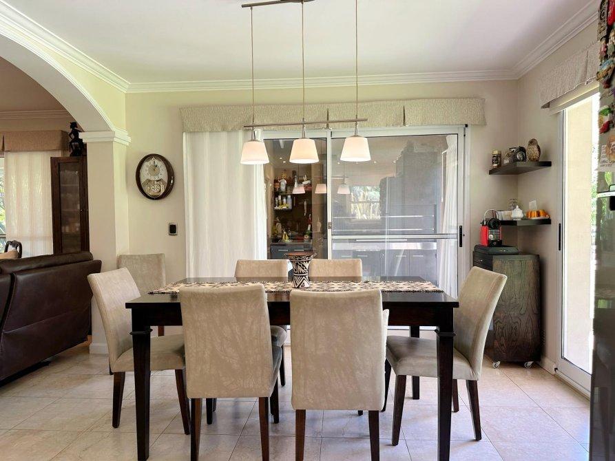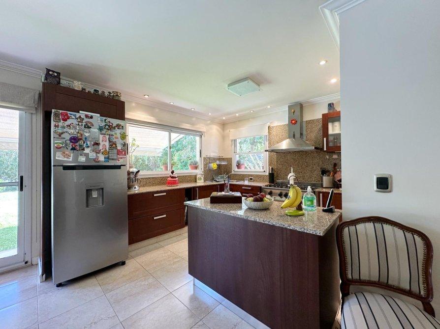 P.B.: Hall de ingreso, amplio Living - comedor con salida al quincho o al jardín, cocina integrada a traves de gran isla con vista al jardin. Lavadero independiente. Dormitorio o escritorio con placard. Baño completo con ducha y doble circulacion al quincho. Depósito bajo escalera. Quincho cerrado con parrilla, mesada y bacha, portón de ingreso vehicular con espacio para 2 autos, sala de maquinas y depósito.