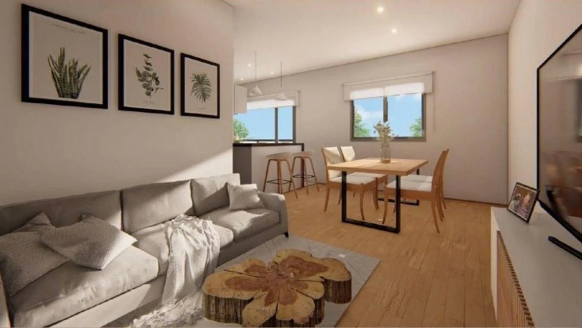 Living comedor con cocina integrada con salida al balcon.
