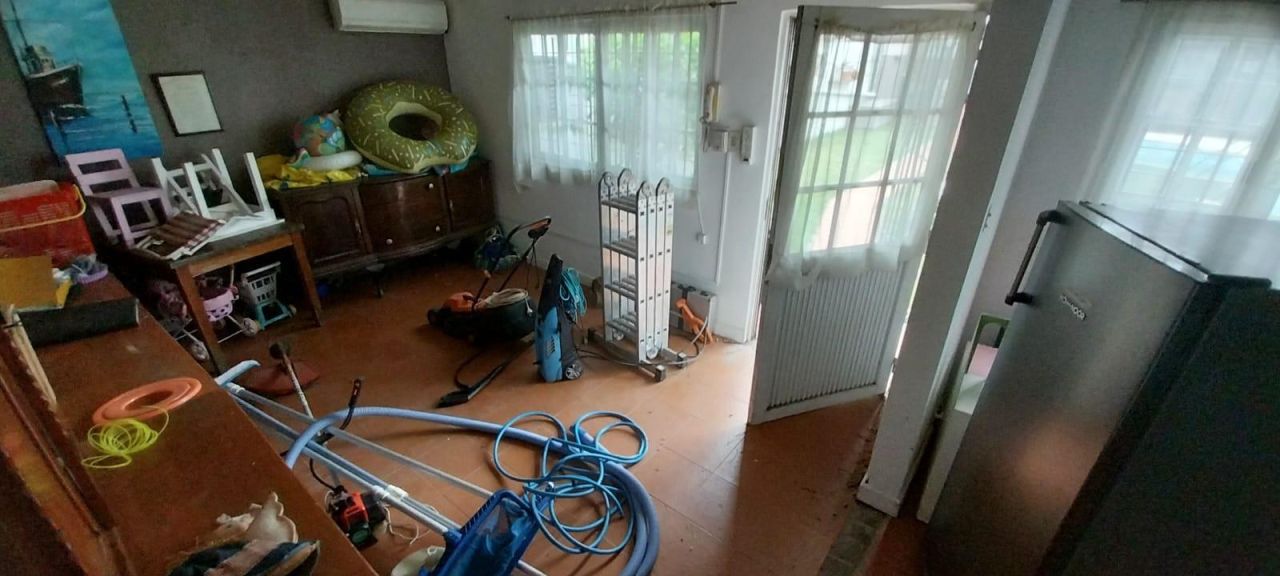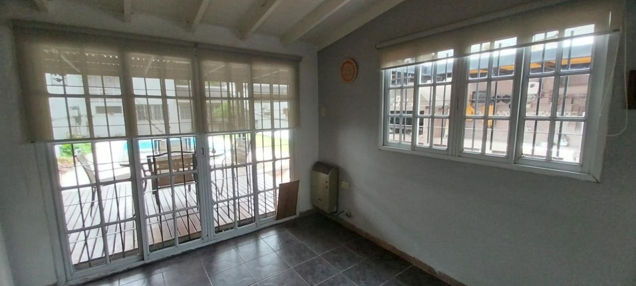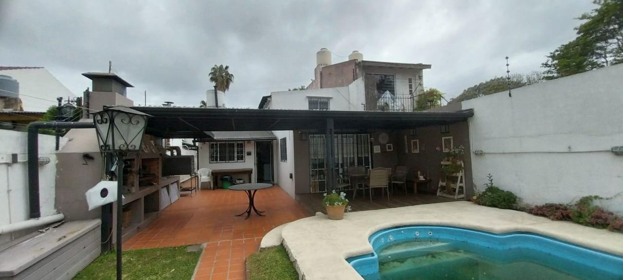 Casa en barrio residencial de Lomas de Zamora, básicamente consta de: Reja al frente - Cochera para un auto con portón corredizo automatizado - amplio living cocina comedor todo integrado, la cocina tiene muebles de bajo y sobre mesada, del living sale una escalera caracol que  lleva a un ambiente en planta alt ( posible 3° dormitorio), lavadero- quincho semicubierto con parrilla - fondo libre - piscina - y al final del terreno posee un departamento de 2 ambientes en 2 plantas. Lote de 866 x 39. MEDIDAS APROXIMADAS.