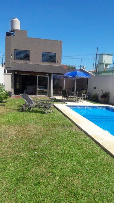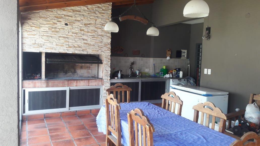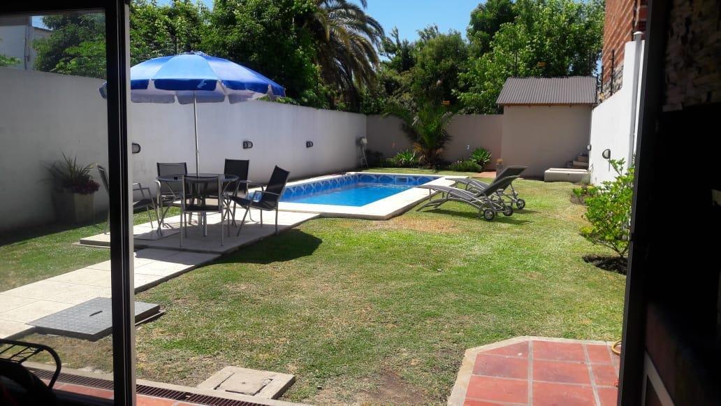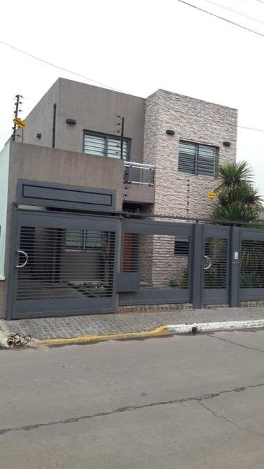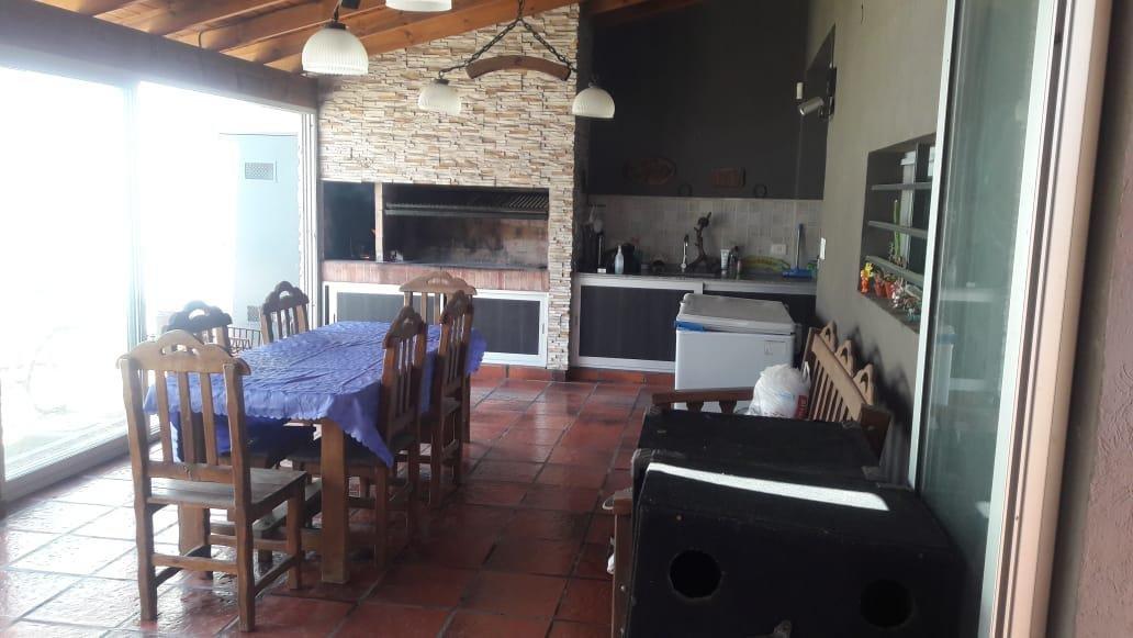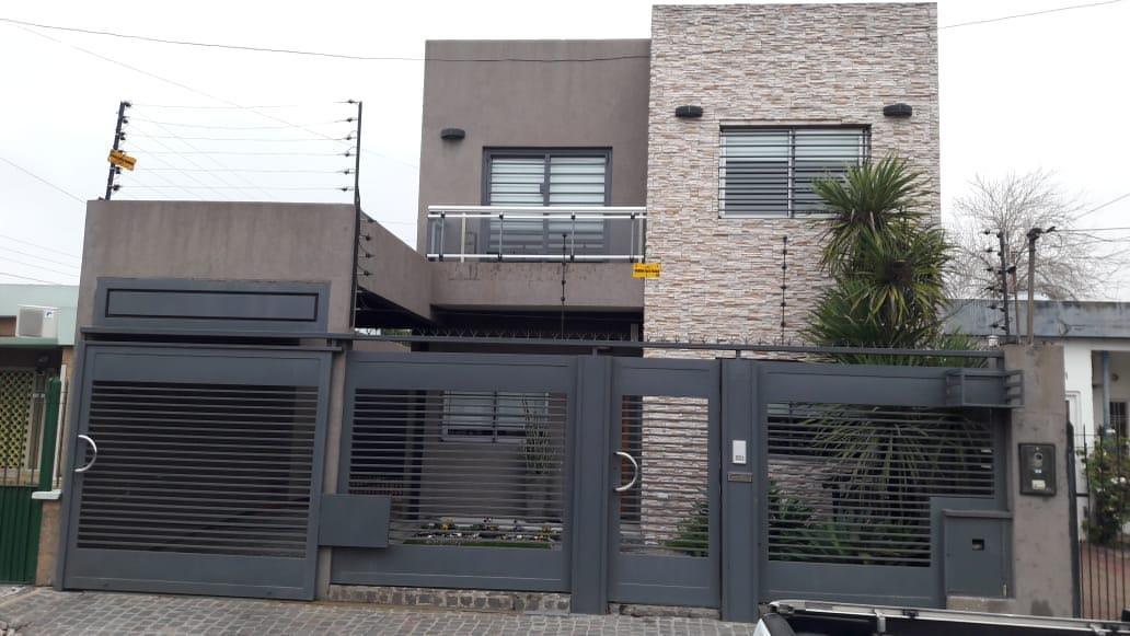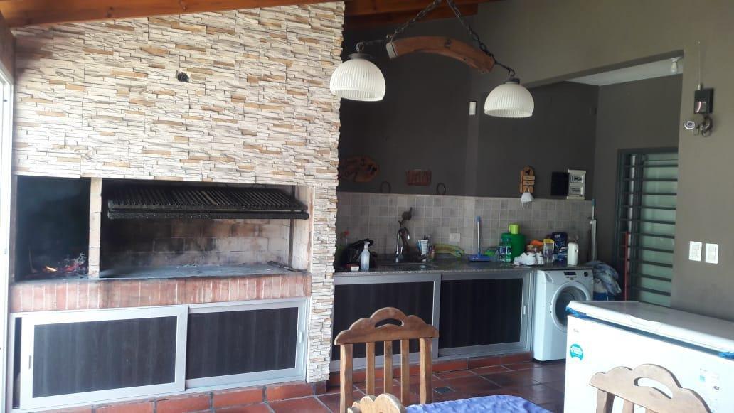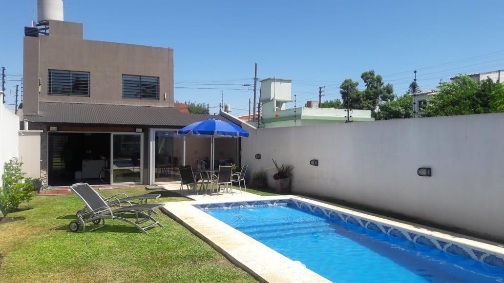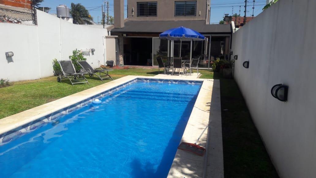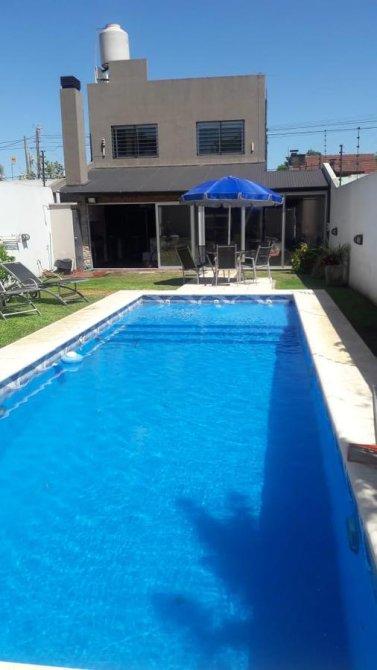 Merlo; hermosa propiedad, muy buena ubicación, con un lote de 10 x 37,50 Mts, 250 Mts Construidos, distribuida en dos plantas, PB: doble cochera cubierta pasante, living cocina comedor Americana, baño completo,, Galeria, Lavadero, quincho cubierto, fondo libre con piscina. PA: 4 Dormitorios, baño completo.