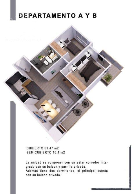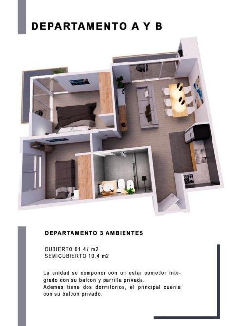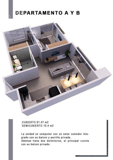 Las unidades contarán con un metraje cubierto de 61.47 m² y estarán compuestas por amplio living comedor con cocina integrada y balcón de 5 m², baño completo y 2 dormitorios con balcones de 5,5 m² y 3,6 m², baulera y parrilla exclusiva. Cochera opcional