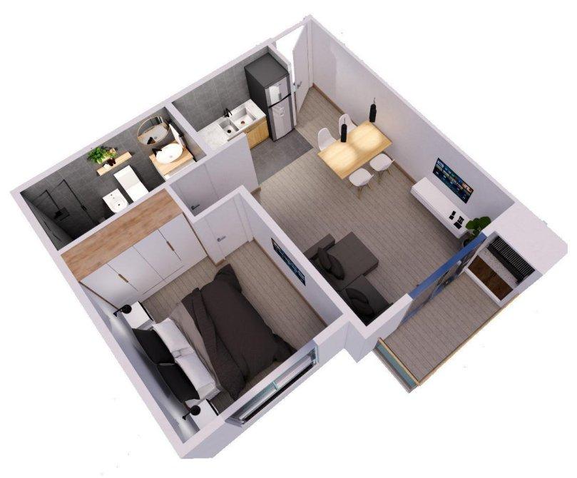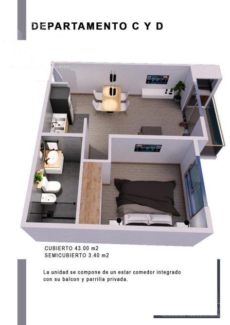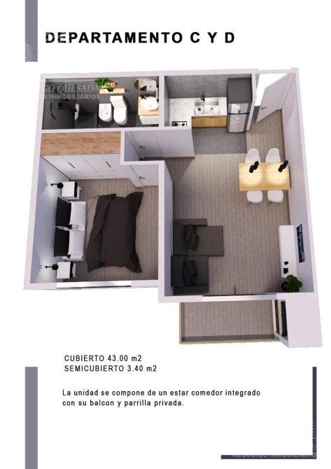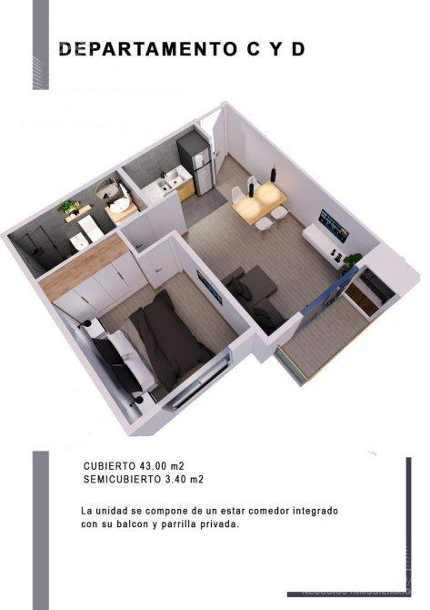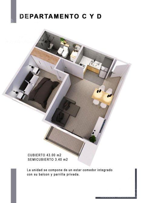 Las unidades contarán con un metraje cubierto de 43 m² y estarán compuestas por amplio living comedor con cocina integrada con balcón de 3,38 m², baño completo y 1 dormitorio. Además poseen baulera y parrilla exclusiva. Cochera opcional