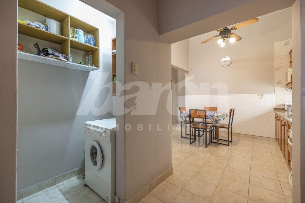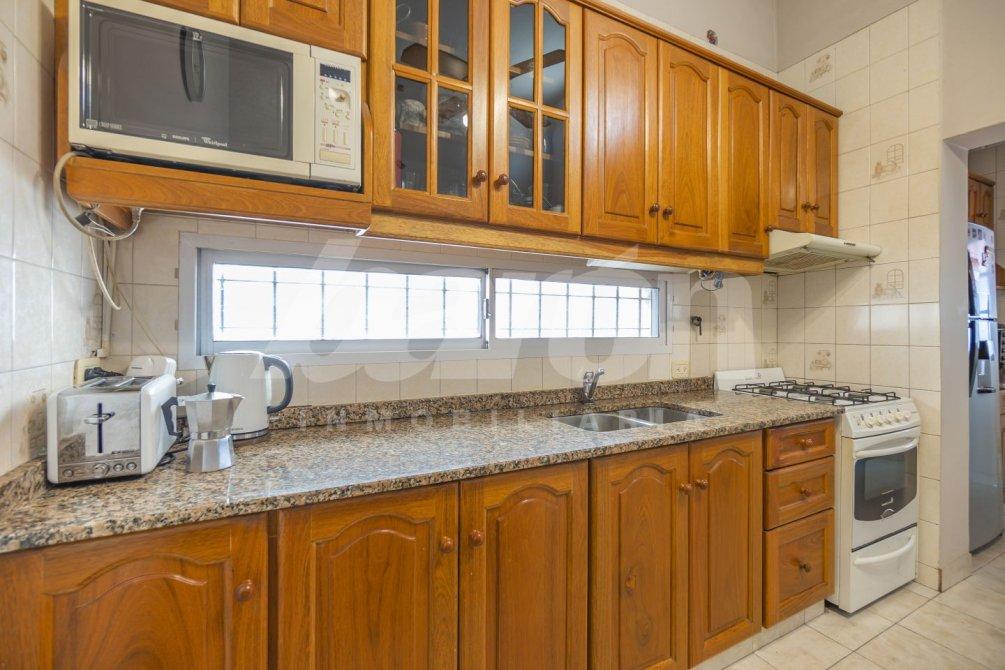 A continuación, se encuentra la cocina comedor diario, con pisos cerámicos, muebles bajo y sobre mesada con amplio espacio de guardado, mesada de granito y ventana al pasillo lateral, que brinda excelente ventilación y luminosidad. En este mismo sector, la propiedad cuenta con un lavadero semi integrado con pre instalación para lavarropas.