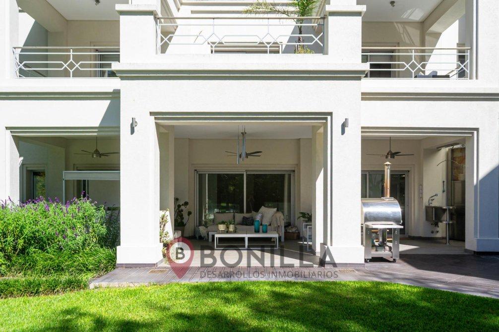 - Jardín con vista al golf totalmente parquizado con riego por aspersión y grama bahiana