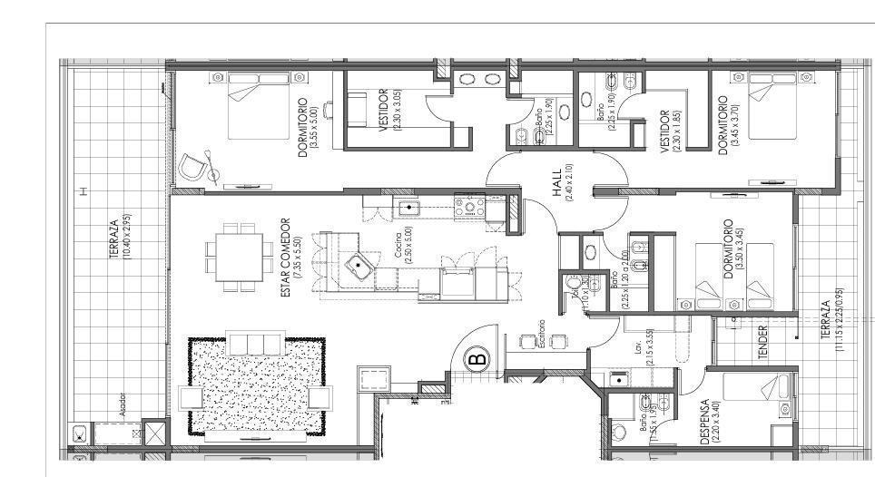 DEPTO. 5°.” A”: Frente complejo de 2 dormitorios, 1 con vestidor, 3 baños, 1 en suite, escritorio, terraza con asador y tender (34 m2), 2 cocheras con baúl, con una superficie total de 347.42 m2. El precio es USD 518.611. – superficie propia 169.15 m2 + superficie terraza 20,15m2.