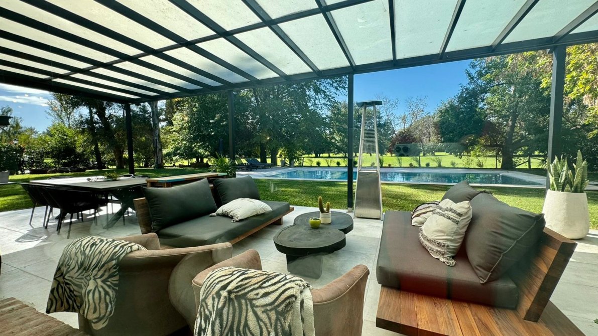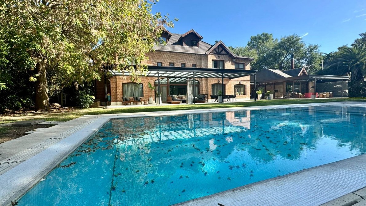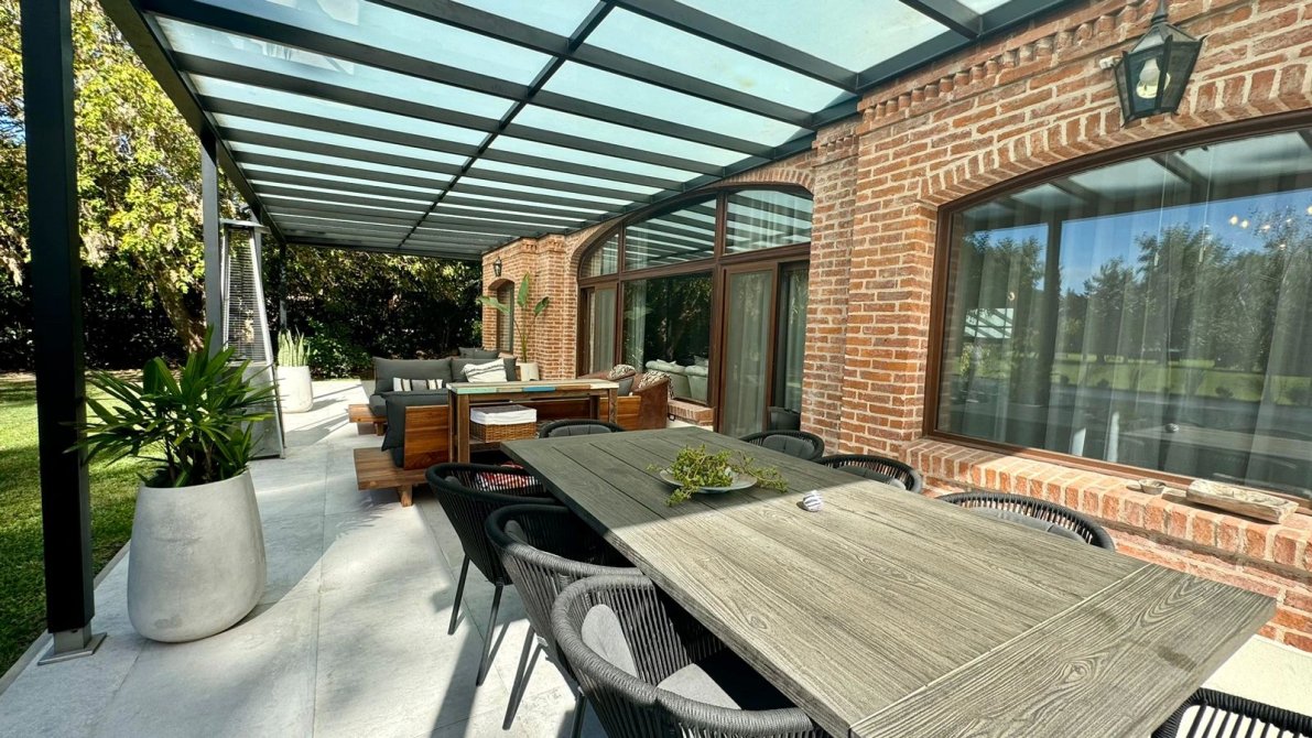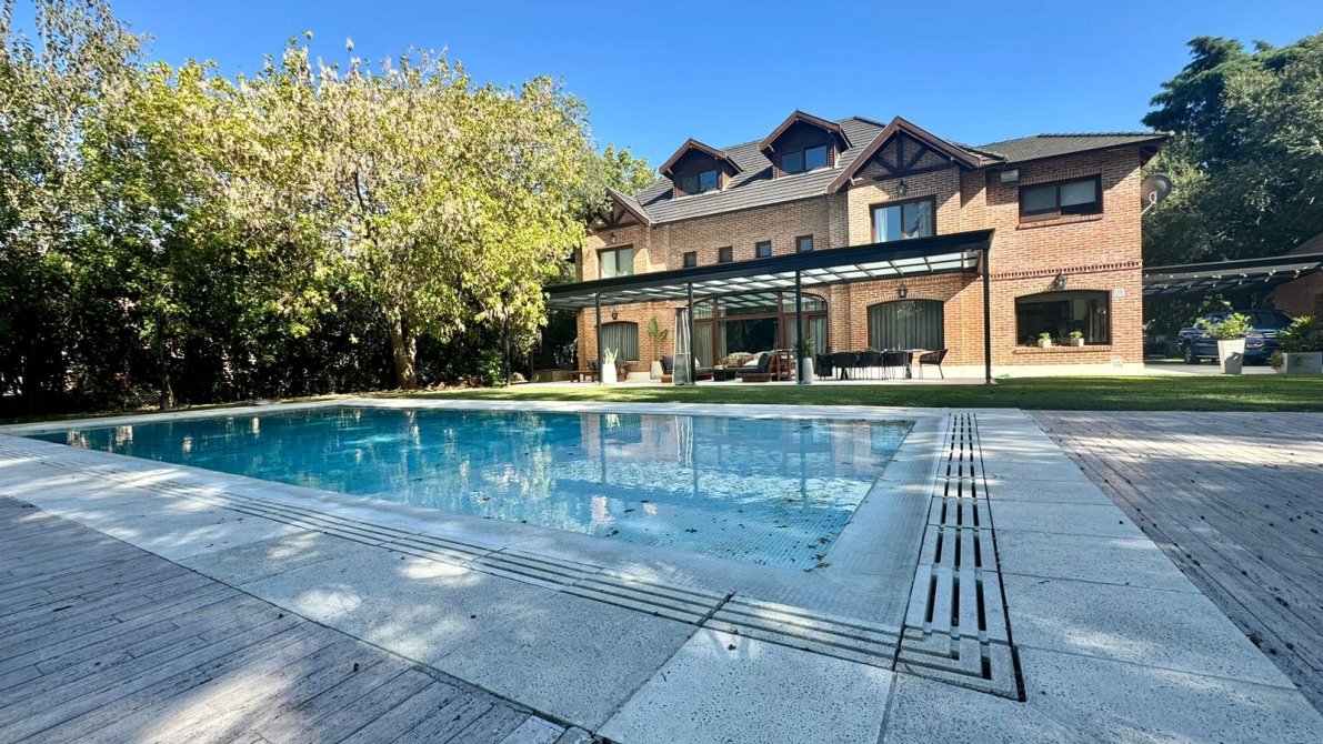 Amplio jardín parquizado en estado impecable con fondo al golf con árboles añosos otorgando un lugar de calidez y paz.