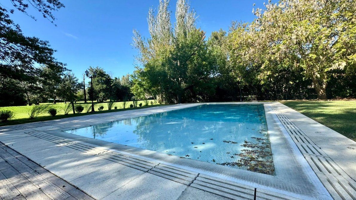 Piscina de 12×5 mts revestida con venecitas con solárium húmedo con dimensiones únicas.