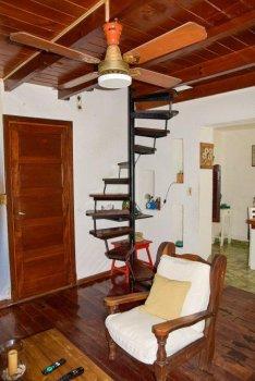 Living-comedor con hogar y escalera caracol.