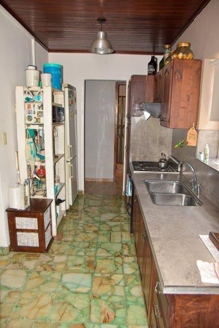 Cocina con pisos de mármol original, muebles sobre y bajo mesada, y espacio para artefactos.