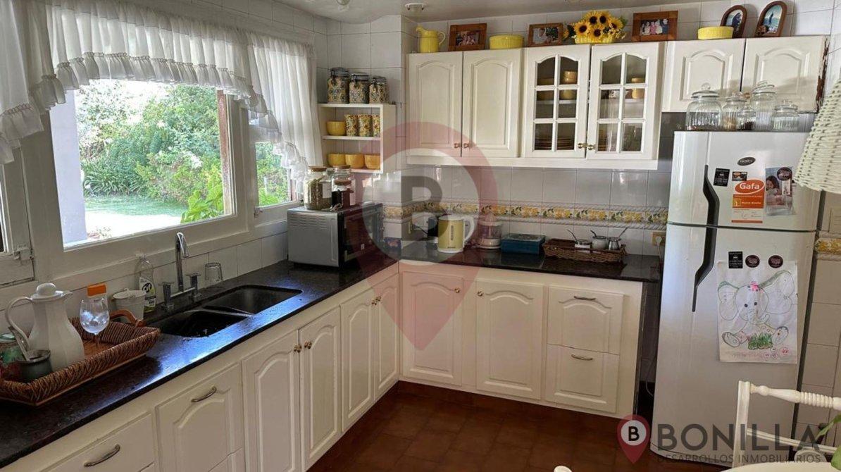 - Cocina comedor con muebles bajo mesada, alacena y vista al jardín