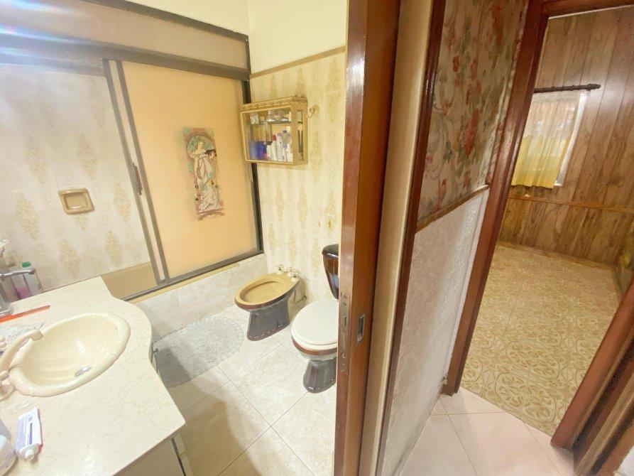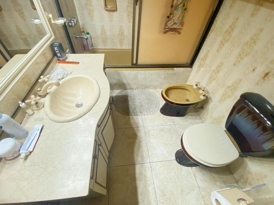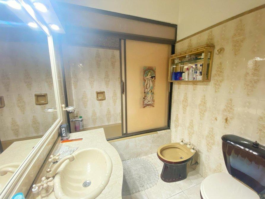 Baño totalmente instalado con bacha y mesada de marmol a medida, espacio de guardado, inodoro, bidet y bañera con mampara.
