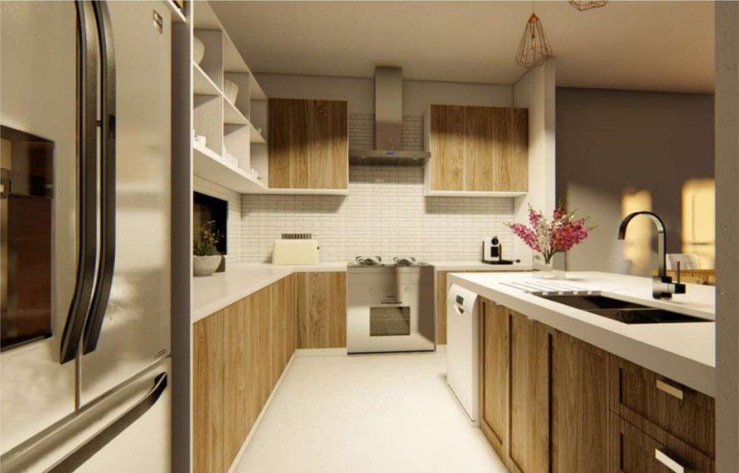 - Cocina totalmente equipada, con mesada de granito, bacha de acero, muebles en melamina, bajos y alacena, con accesorios y herrajes de primera línea. Artefacto de cocción, cocina y purificador de acero inoxidable, primera marca. Grifería mono comando. Pisos de porcelanato.
