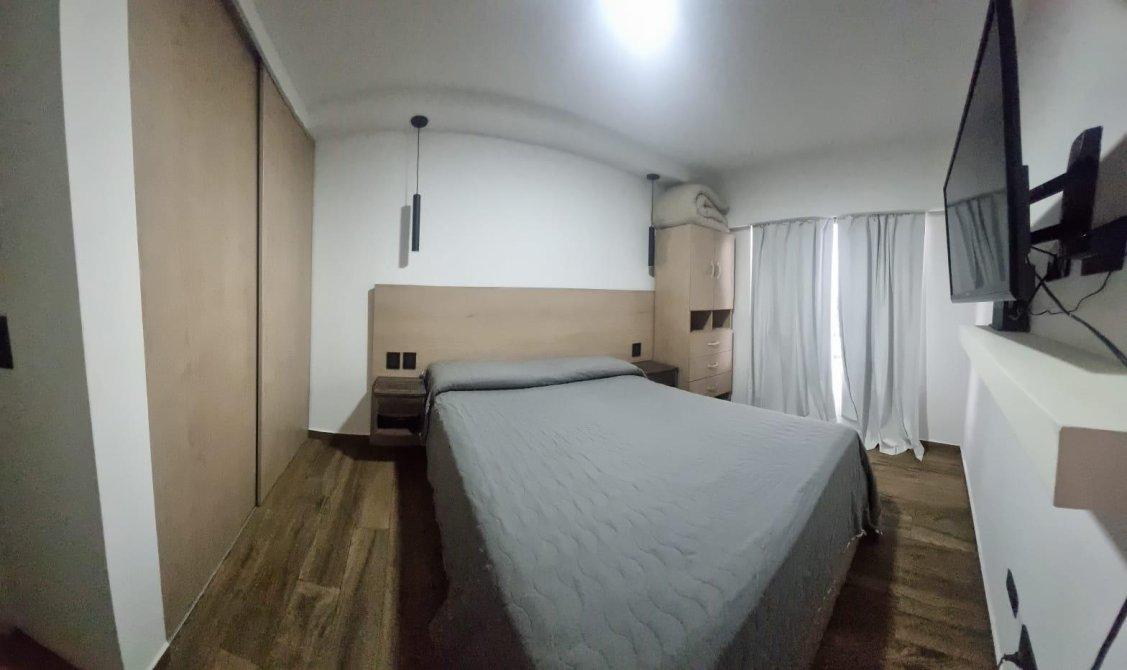 Amplio living comedor con cocina incorporada, balcón al frente, un dormitorio con placard y baño completo