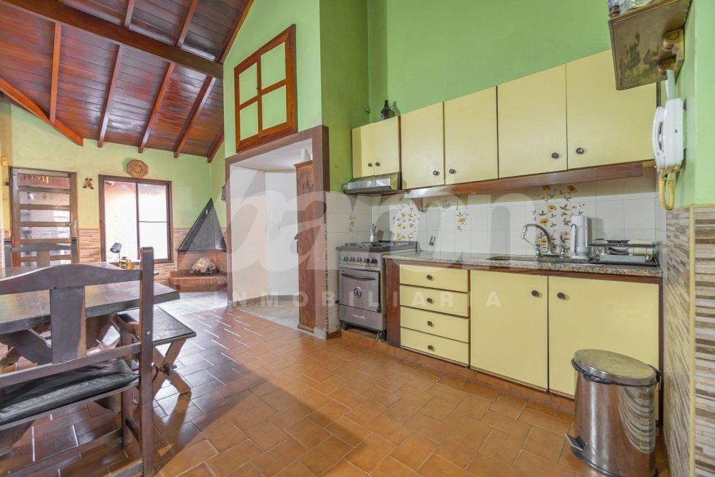 En planta baja, al ingresar, se accede a un recibidor con hogar a leña, que aporta calidez y carácter. A través de un pasillo distribuidor, se accede a cinco dormitorios, dos de ellos de mayores dimensiones, todos luminosos y ventilados. Esta planta cuenta con un baño completo con bañera y ducha, y una cocina independiente totalmente amueblada, con salida a un patio descubierto donde se encuentra un horno de barro.