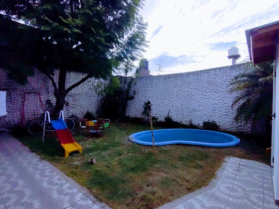 . Parque con pileta tipo riñón de PVC y baño externo.