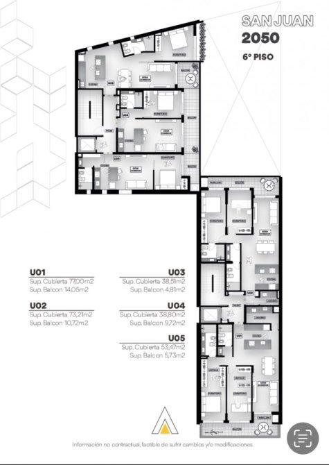 Edificio SS, PB y 9 pisos. Torre frente semipisos de dos dormitorios. Torre contrafrente, 3 unidades por pisos de 1 dormitorios.