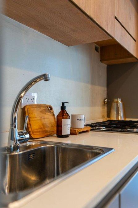 Alacenas y bajo-mesadas de diseño: MDF 18mm laminados con filos de PVC, zócalos de acero inoxidable.