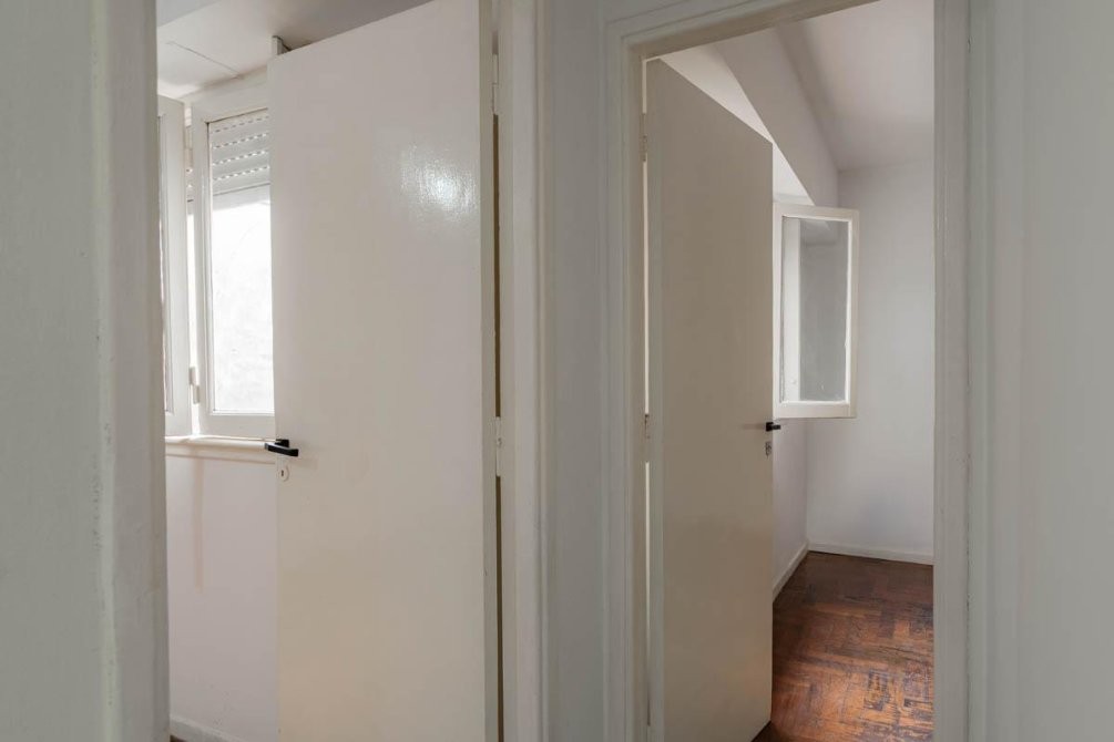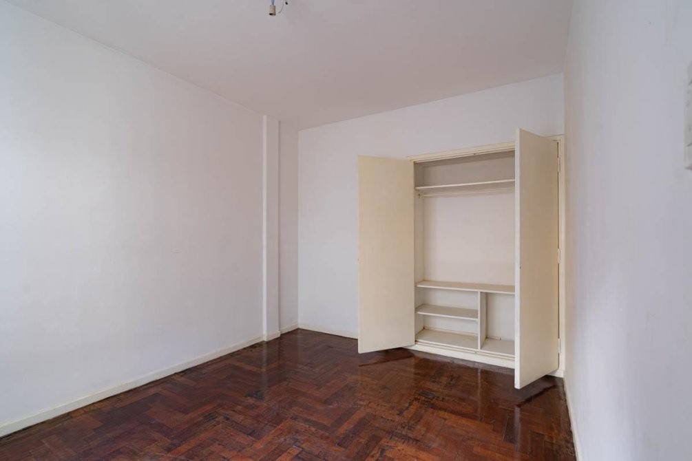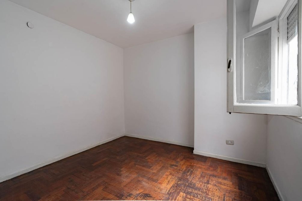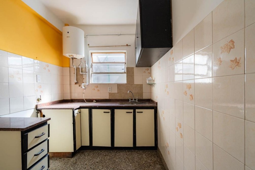 El departamento cuenta con un living comedor, cocina completa con mueble bajo mesada y lavadero incorporado. Dispone de dos dormitorios con pisos de madera plastificados, placard en el dormitorio principal, y un baño completo con bañera. Además, tiene una terraza compartida y artefactos eléctricos.