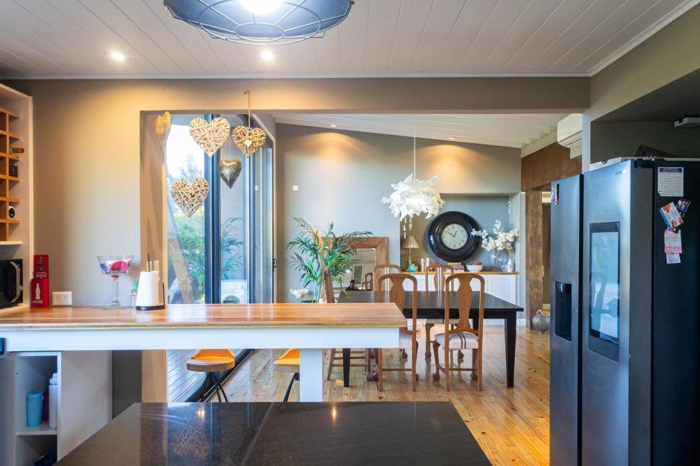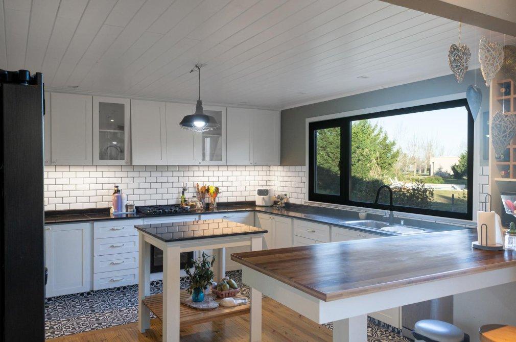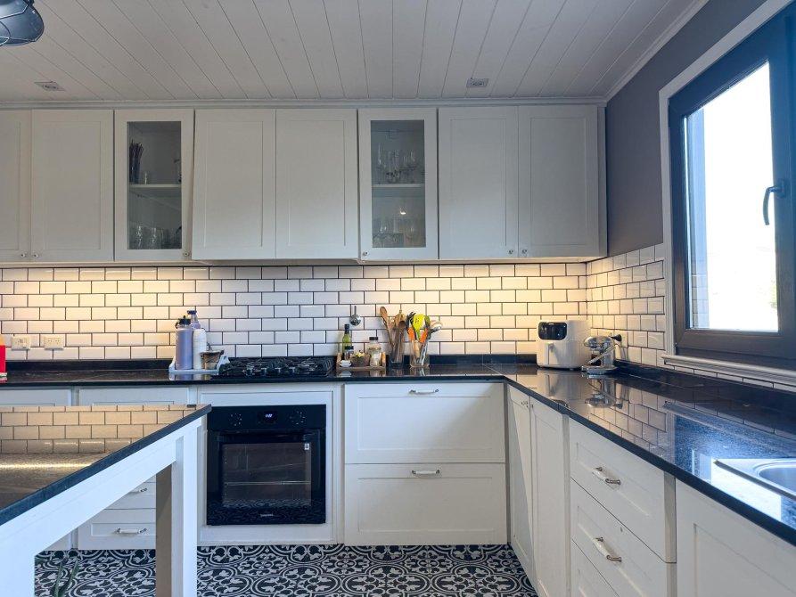 En el ala izquierda, la cocina de generosas dimensiones y equipada con mobiliario de calidad, con isla y barra desayunadora se integra a un comedor diario, con acceso directo a una galería exterior que cuenta con parrilla y bacha.