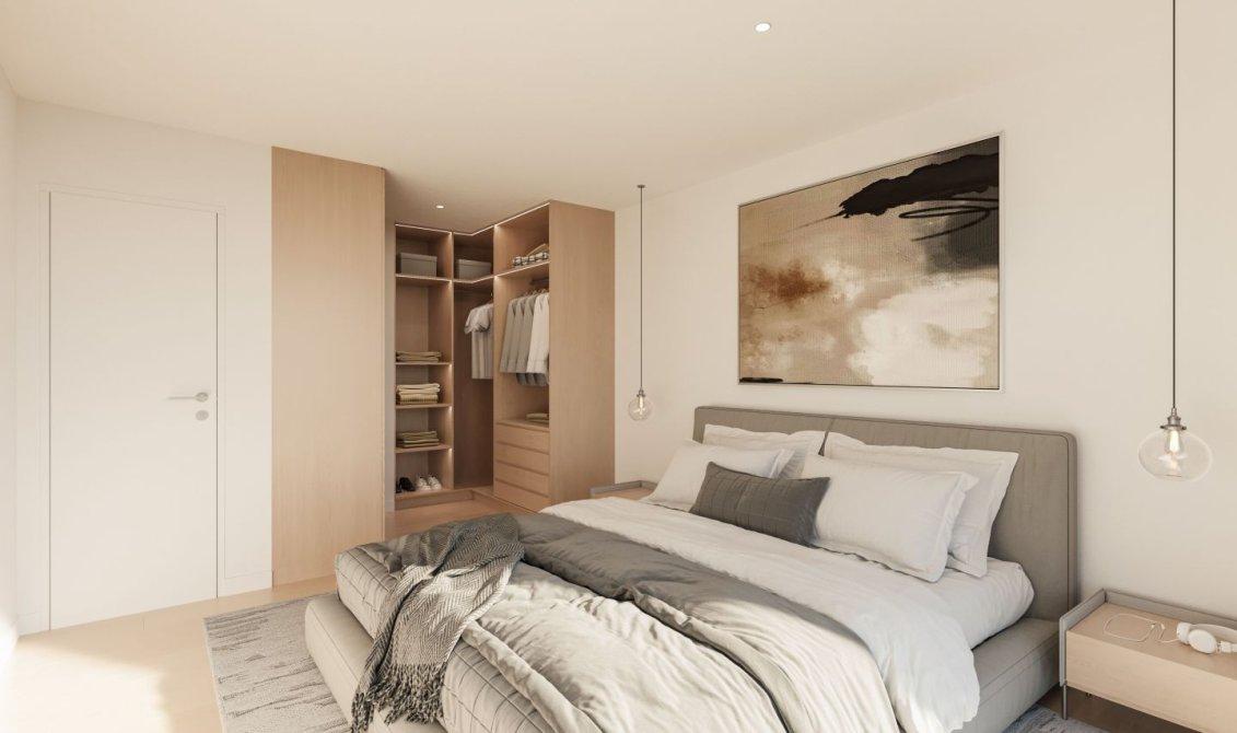 La cocina estará integrada al ambiente y equipada con muebles bajo y sobre mesada en cuarzo, artefacto de cocina y anafe. A continuación, se dispondrá un toilette de recepción.