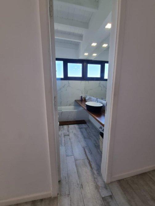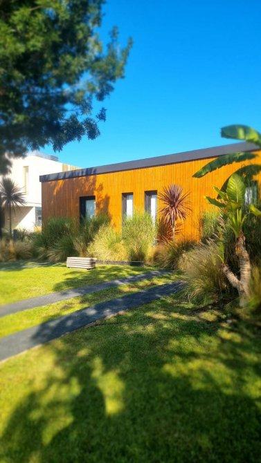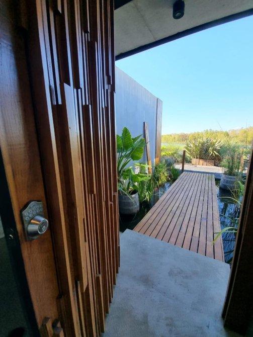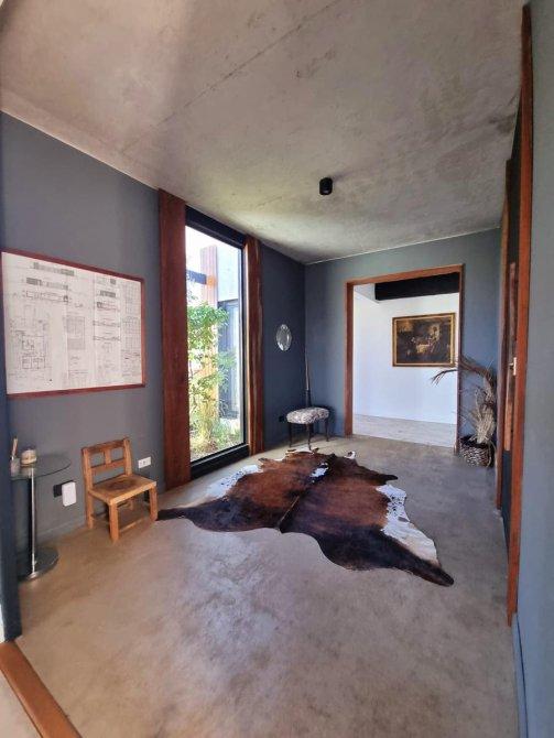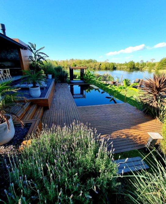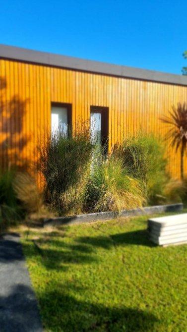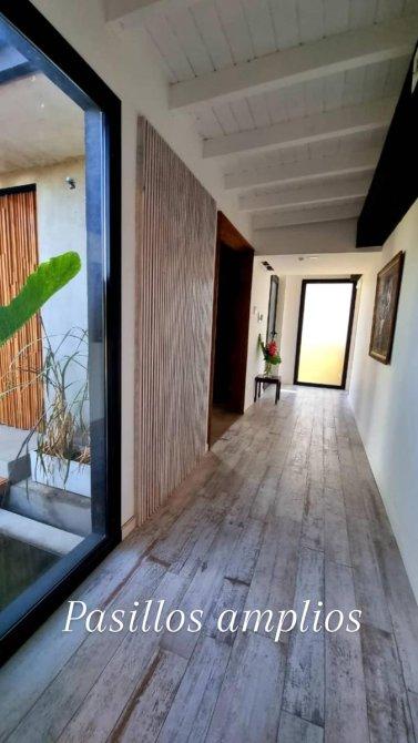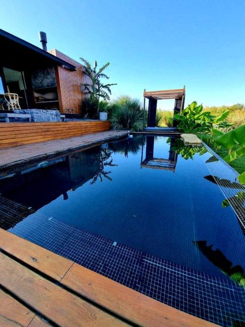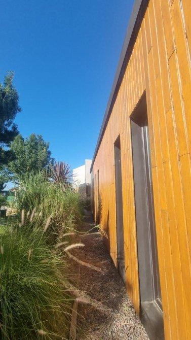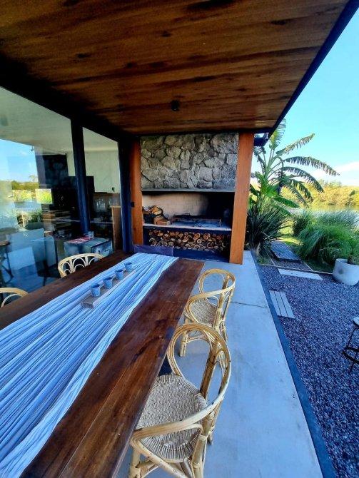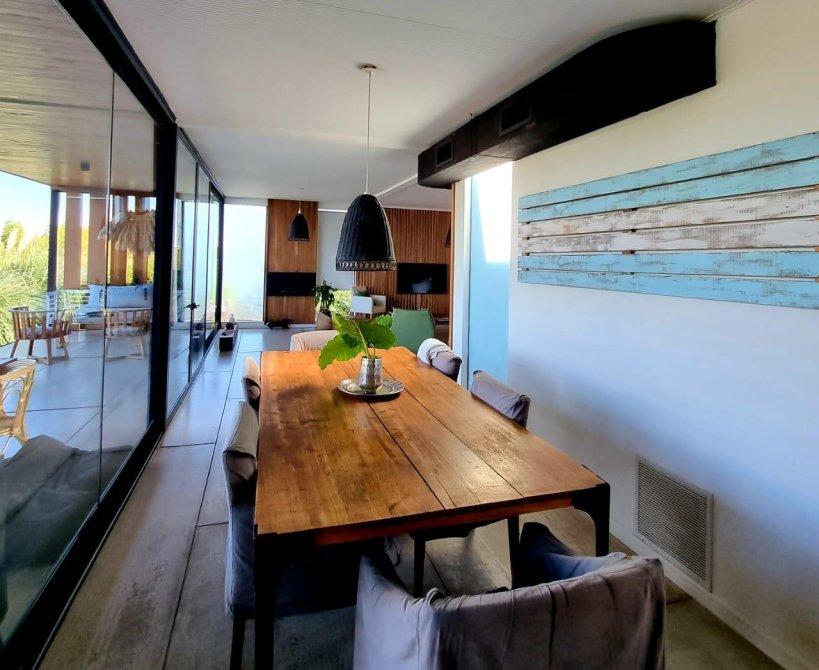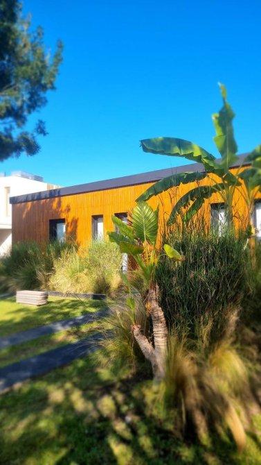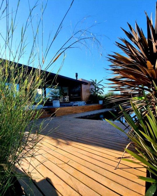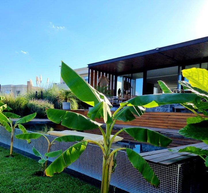 Excelente casa moderna en 1 planta con fondos al agua y vistas a reserva ecológica. Entrada principal mediante puente de madera sobre estanque de agua .Amplio hall de entrada, living y comedor, toilet, cocina con comedor diario y patio de servicio con lavadero. 3 dormitorios en suite, principal con vestidor. Exterior: Galeria con parrilla, jardín con pileta azulejada , con cascada y climatizador. Dependencia de servicio (o cuarto depósito) con baño. Riego por aspersión. Revestimiento y decks de lapacho. Cerramientos de PVC DVH Marca Rehau. 2 centrales independientes de aire acondicionado frío-calor. Pisos de porcelananto simil madera (dormitorios) y placas cementicias (recepción).