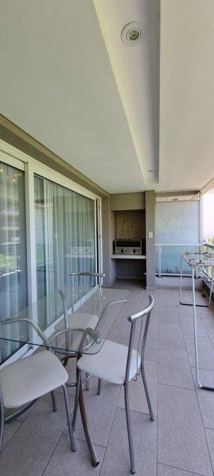Amplio living/comedor con ventanales completos al frente hacia balcón aterrazado con parrilla.