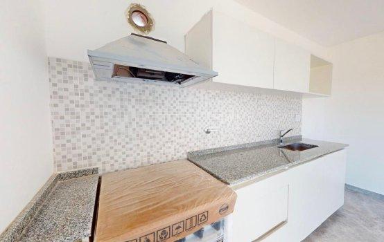 Cocina completa con espacio de guardado, mesada de mármol, horno nuevo.