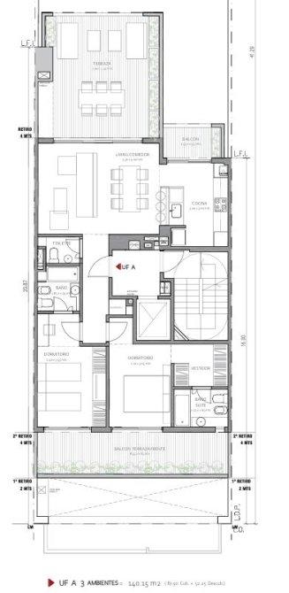 Departamento 7º A – 3 ambientes de 140,15 m² (87,90 m² cubiertos + 52,25 m² descubiertos)
