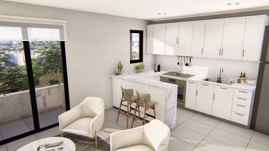 Primer Planta:  Cocina comedor con isla tipo barra, toillete  y amplio balcón corrido.
