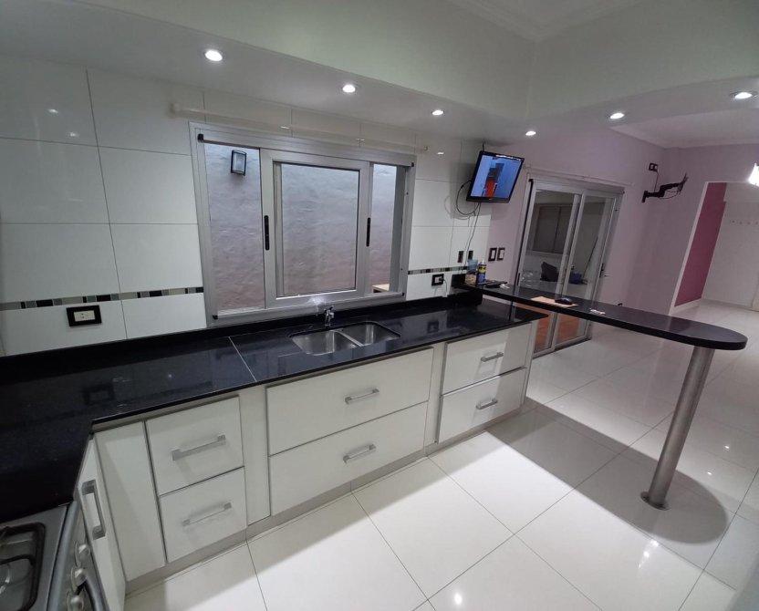 Porch de entrada; living-comedor; comedor diario; cocina; 1 baño completo con antebaño; 2 dormitorios con placard; 1 dormitorio/escritorio; patio interno tipo pulmón; garage pasante para dos autos con portón levadizo; patio; amplio quincho con parrilla, cocina y baño instalado completo.