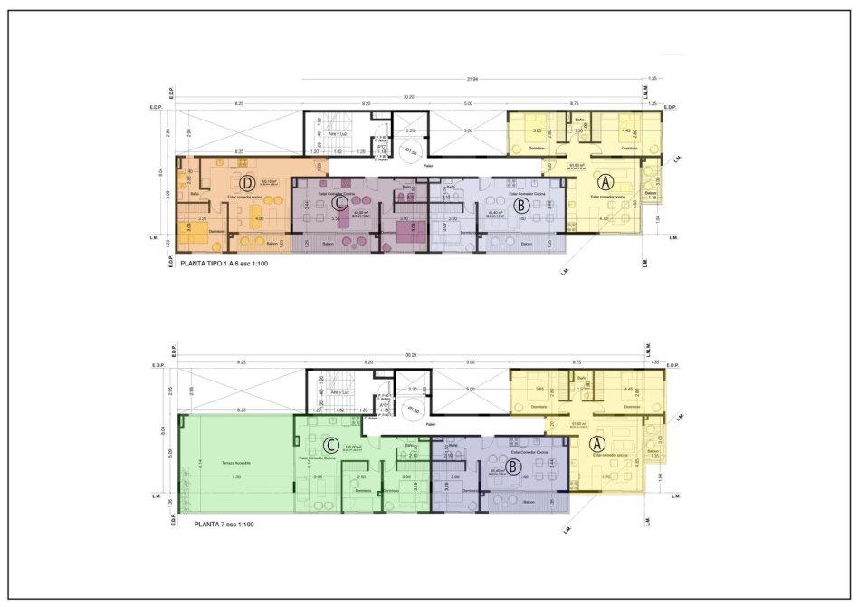 En planta baja se situaran nueve cocheras independientes para el uso residencial. En los pisos del 1ro al 6to se proyectan tres unidades de dos ambientes con balcon privado y una de tres ambientes tomando la situacion de esquina. Por otro lado las plantas del 7mo al 9no se desarrollaron dos unidades de tres y una de dos ambientes.