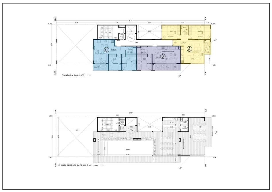La estrategia en relacion a dicho terreno es plantear un edificio contemporáneo, tomando la situación de esquina como fortaleza para generar unidades luminosas con visuales a la ciudad. Dejando la planta baja para el uso de estacionamiento y acceso; para luego llevarnos a un piso de uso común con una terraza equipada con pileta, quincho, baño y parrilla como remate del edificio, poniendonos en una posicion privilegiada con vista al rio.
