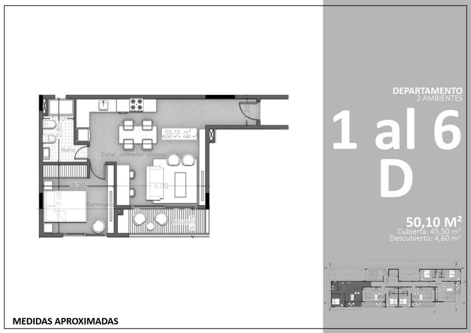Departamento de dos ambientes con balcon a la venta en el 1º al 6º piso. Letra B.