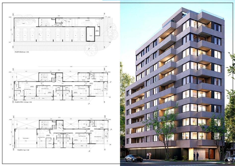 La estrategia en relacion a dicho terreno es plantear un edificio contemporáneo, tomando la situación de esquina como fortaleza para generar unidades luminosas con visuales a la ciudad. Dejando la planta baja para el uso de estacionamiento y acceso; para luego llevarnos a un piso de uso común con una terraza equipada con pileta, quincho, baño y parrilla como remate del edificio, poniendonos en una posicion privilegiada con vista al rio.
