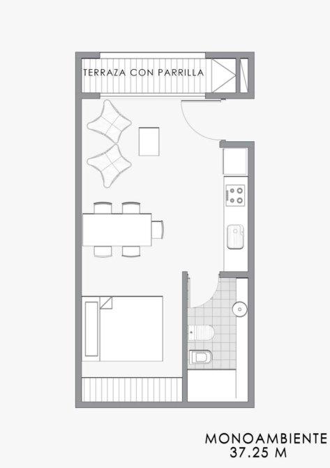 El departamento cuenta con living-comedor, cocina, terraza al frente con parrilla y habitación con placar.