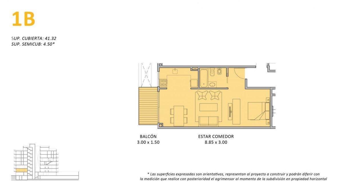 En construcción. Departamento de 1 ambiente con balcón al frente. URBAN BUILDING 17 UNIDADES de 1, 2, 3 y 4 ambientes Anticipo de u$s 34.600 + 24 cuotas fijas en dólares (o pesos + CAC) Entrega