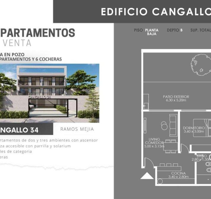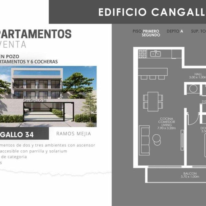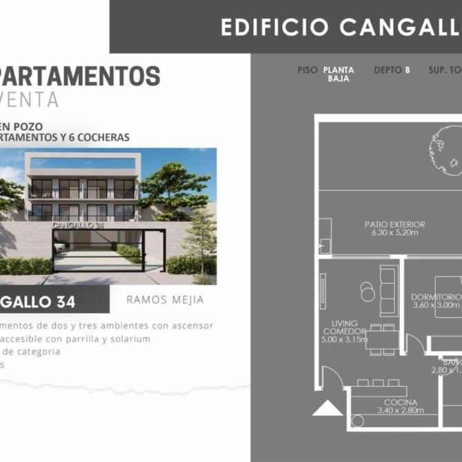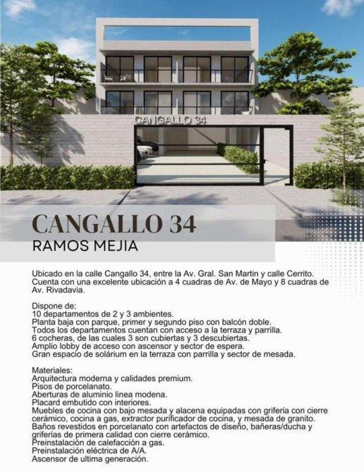 VENTA - POZO- DTO.2AMB.-1ºY2º P. - 50 %AL BOLETO Y RESTO EN 24 CUOTAS FIJAS ---- 10 DEPARTAMENTOS-- -- 6 COCHERAS -- DESCRIPCION: EXCELENTE PROYECTO DE DEPARTAMENTOS DE 2 Y 3 AMBIENTES CON ASCENSOR DESDE U$$ 90.000. TERRAZA ACCESIBLE CON PARRILLA Y SOLARIUM. DETALLES DE CATEGORIA. COCHERAS. COCINA COMEDOR CON MUEBLES Y ARTEFACTOS DE COCINA. BAÑO COMPLETO. DORMITORIO CON PLACARD. UBICADO EN CALLE CANGALLO 34, ENTRE CERRITO Y AV. SAN MARTIN, DE LA LOCALIDAD DE RAMOS MEJIA, PARTIDO DE LA MATANZA, GBA. ZONA COMERCIAL Y GASTRONOMICA. FLUJO PEATONAL Y VEHICULAR. MEDIOS DE TRANSPORTE EN SENTIDO CABA -GBA.